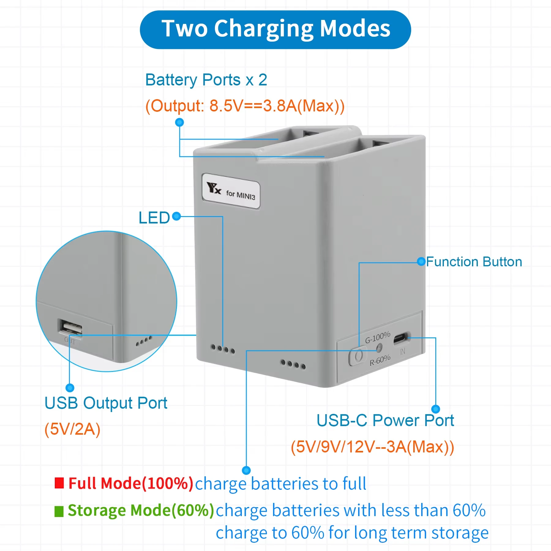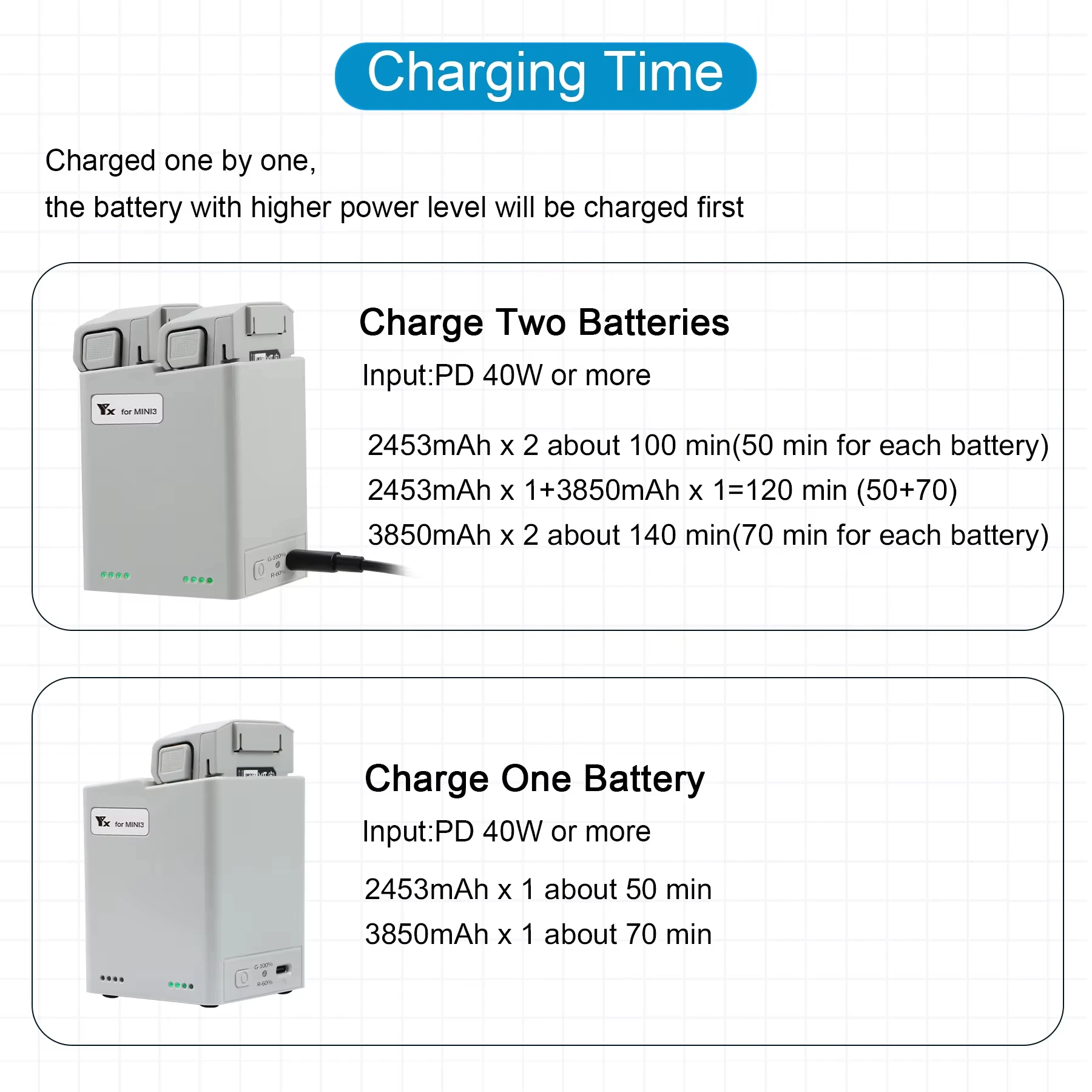 Tiempo de carga: entrada ≥ PD 45W y carga completamente 2 baterías de 2453 mAh durante aproximadamente 60 minutos;