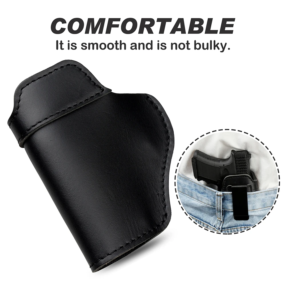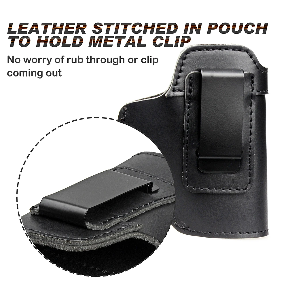 CONFECELENTE CÓMODO Y CLIP RESISTENTE:La funda de cuero para pistola tiene un fuerte clip de metal para una ocultación profunda en cualquier posición de su cinturón y la pistola no saldrá al dibujar.El clip tiene suficiente fuerza para permanecer en su lugar incluso cuando dibuja con una mano.