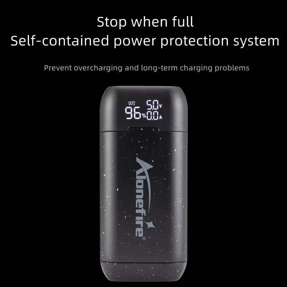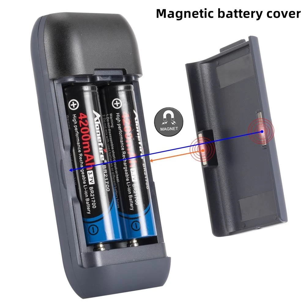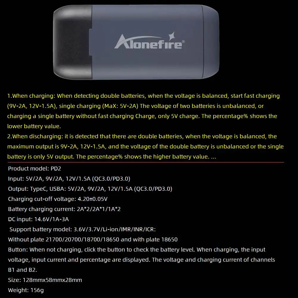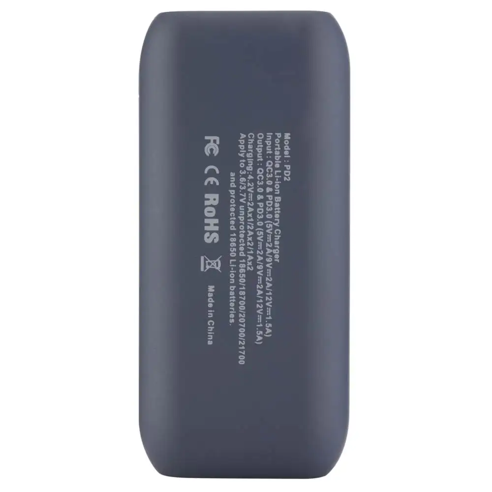 Sin plato 21700/20700/18700/18650 y con plato 18650 Botón: Cuando no esté cargando, haga clic en el botón para verificar el nivel de la batería.Durante la carga se muestran el voltaje de entrada, la corriente de entrada y el porcentaje.El voltaje y la corriente de carga de los canales B1 y B2.