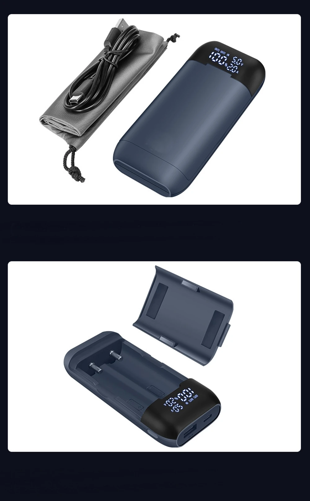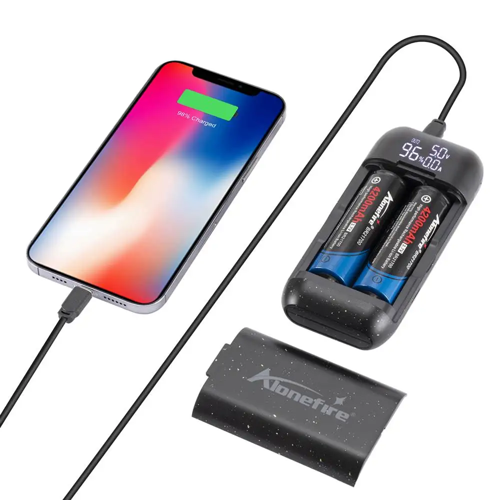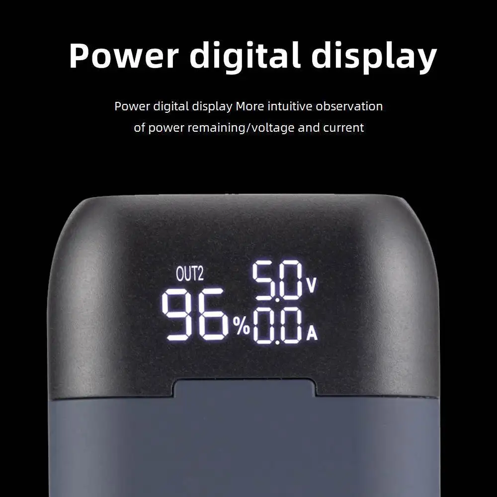 Sin plato 21700/20700/18700/18650 y con plato 18650 Botón: Cuando no esté cargando, haga clic en el botón para verificar el nivel de la batería.Durante la carga se muestran el voltaje de entrada, la corriente de entrada y el porcentaje.El voltaje y la corriente de carga de los canales B1 y B2.
