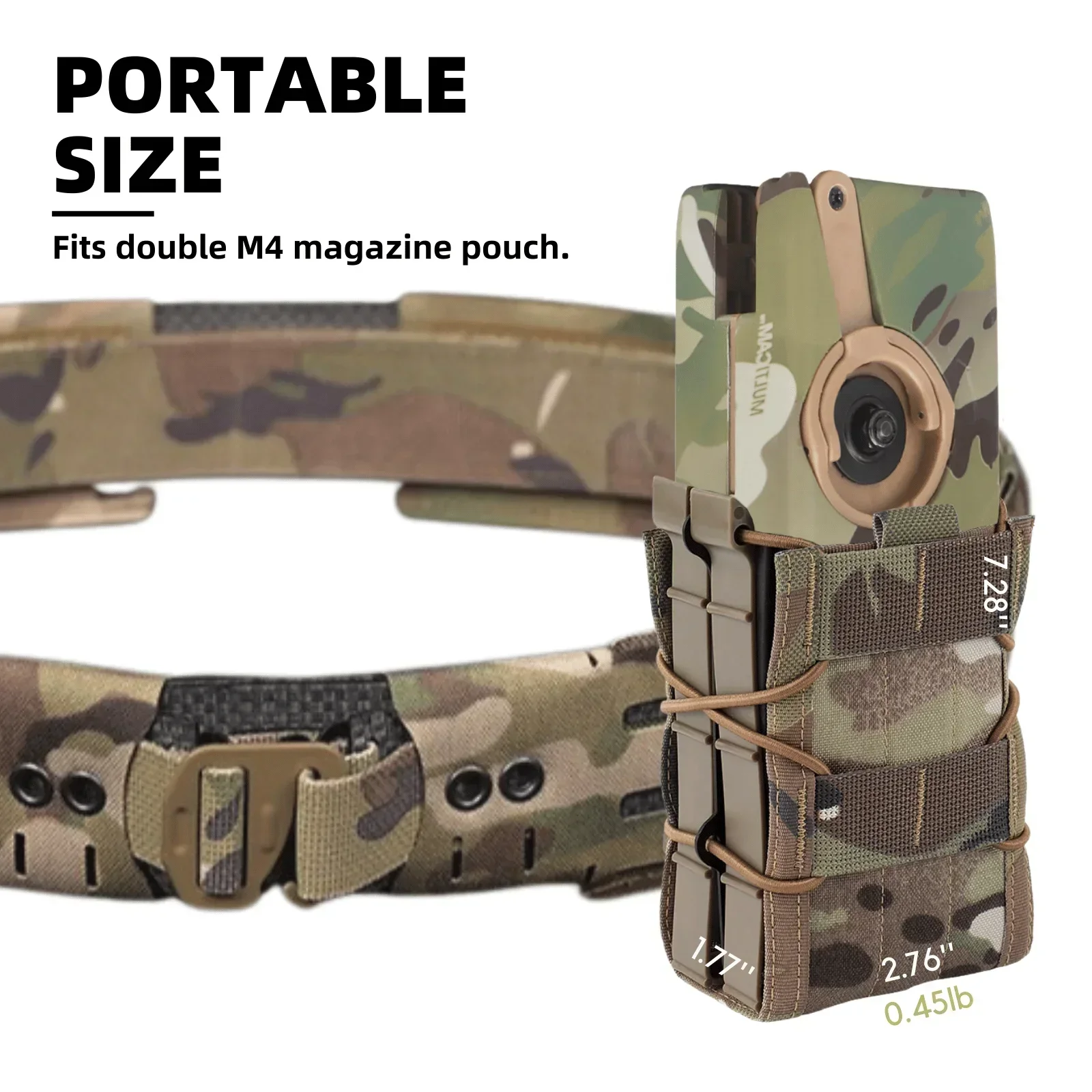 Cabe en una bolsa doble para cargador M4. Ligero y compacto, fácil de transportar y cabe en el estuche de su revista. Con unas medidas de solo 2,76 x 1,77 x 7,28 pulgadas, es muy portátil.