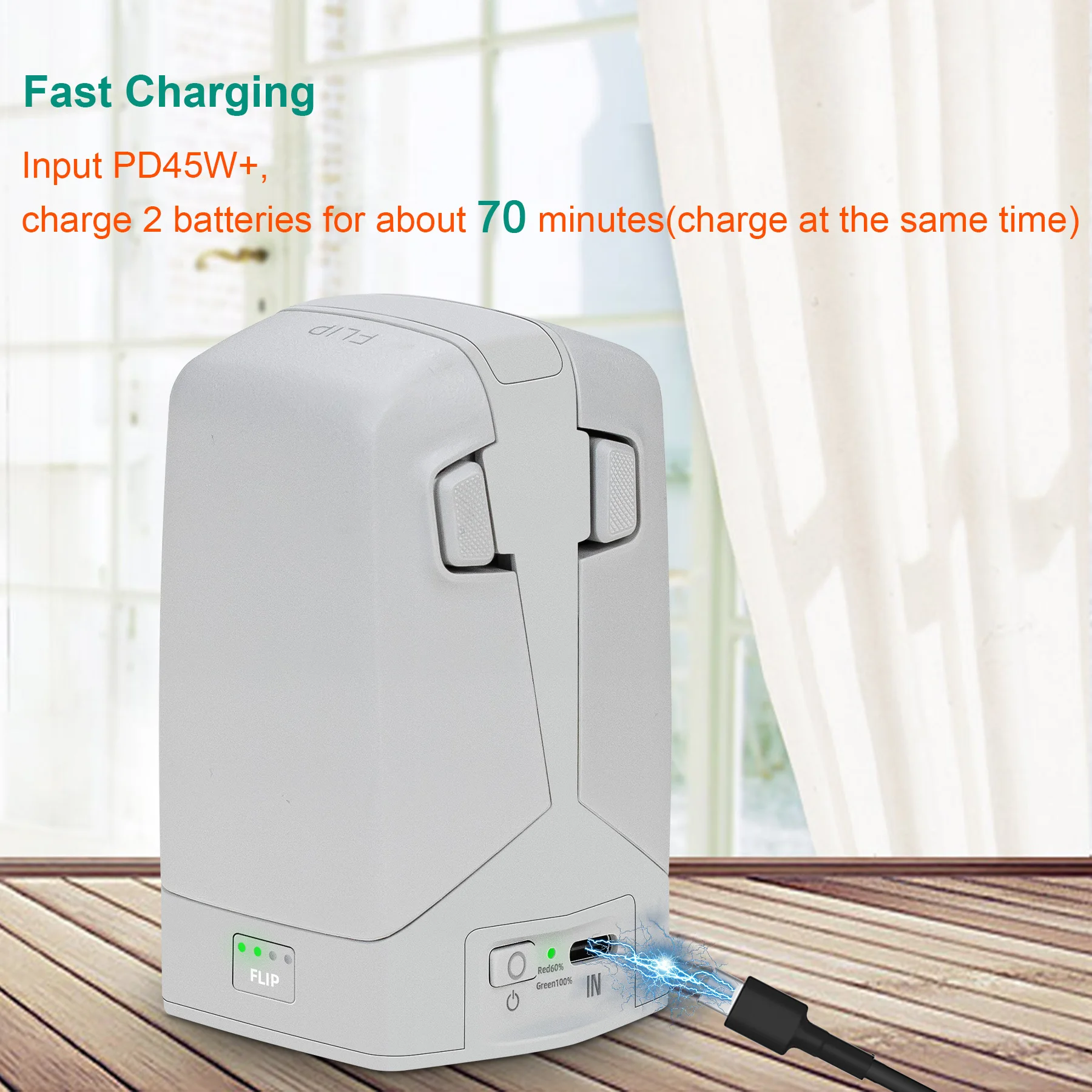 Para una carga más rápida (70 minutos para dos baterías o 45 minutos para una), utilice la entrada ≥PD45W. A ≥25W, el cargador equilibra las baterías antes de la carga dual; por debajo de 25W, se carga secuencialmente (primero más alto). Asegúrese de que se utilicen fuentes de energía compatibles para lograr un rendimiento óptimo.