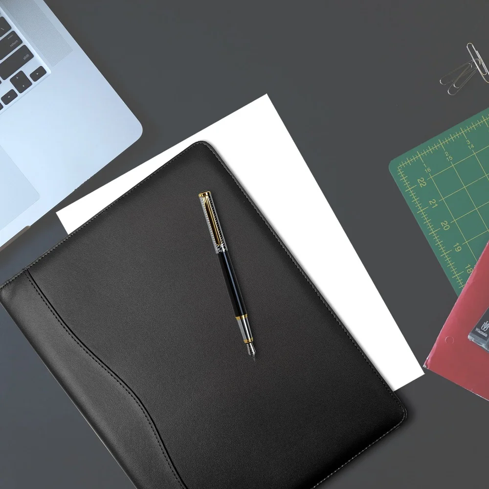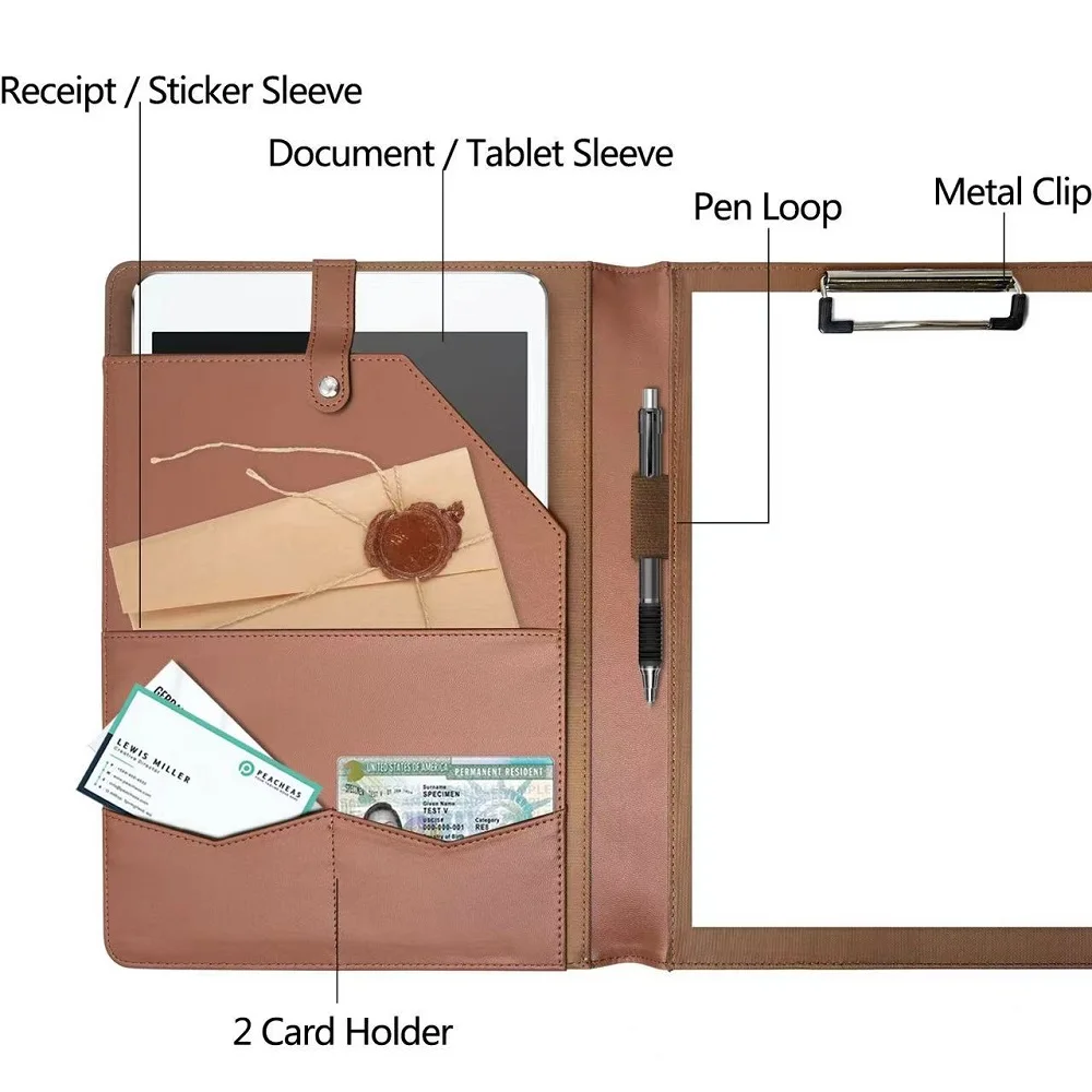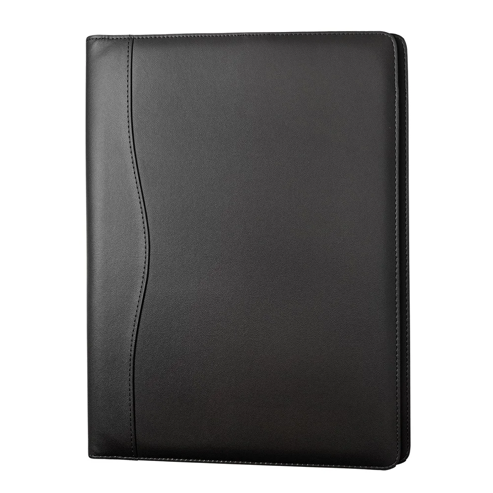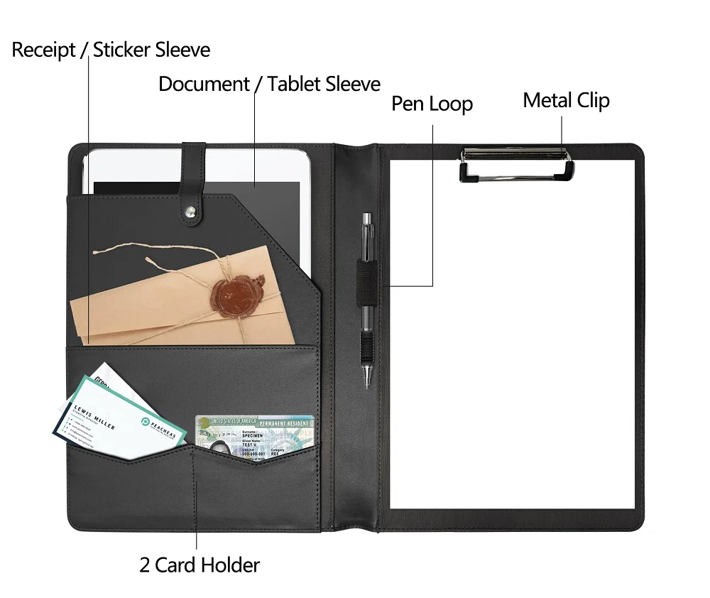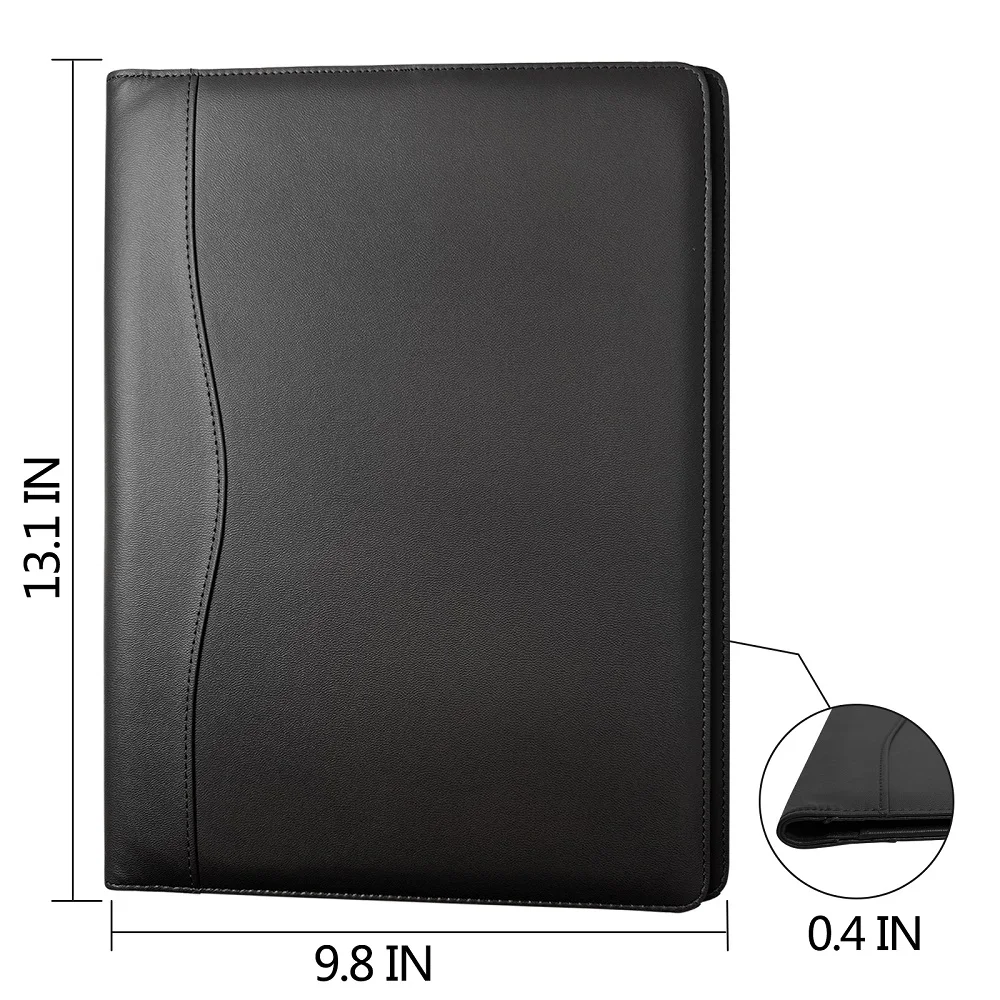 Carpeta de cuero negro con portapapeles: la carpeta de cartera elegante y con estilo está hecha de piel sintética de alta calidad, liviana, portátil y duradera, resistente a la suciedad y no es fácil de romper ni deformar.Esta carpeta de cartera está diseñada con 2 bolsillos, 2 tarjeteros, un lazo para bolígrafo y un clip de metal para guardar y asegurar fácilmente documentos y notas importantes.Durable e impermeable, te permite ir y venir entre la oficina y las reuniones para mantener organizado todo lo que necesitas.