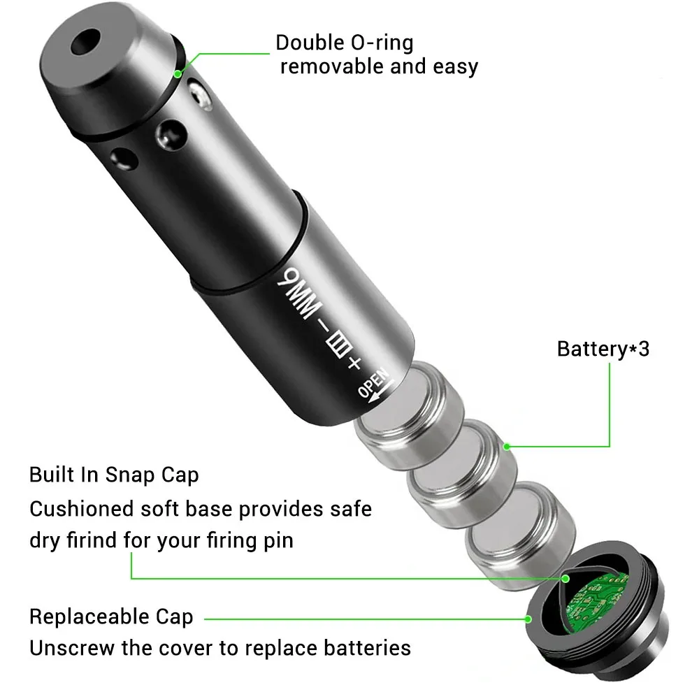 El cartucho de entrenamiento láser utiliza latón resistente, 4 juntas tóricas y una tapa de goma (amortiguando el pasador del delantero para evitar posibles daños por incendio seco), excelente resistencia a la corrosión, lo que garantiza que la mira se pueda aplicar a una pistola o pistola que utiliza balas de 9 mm..
