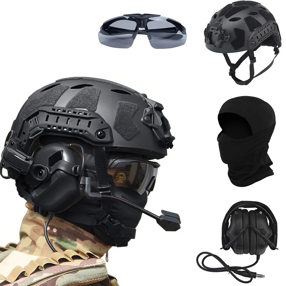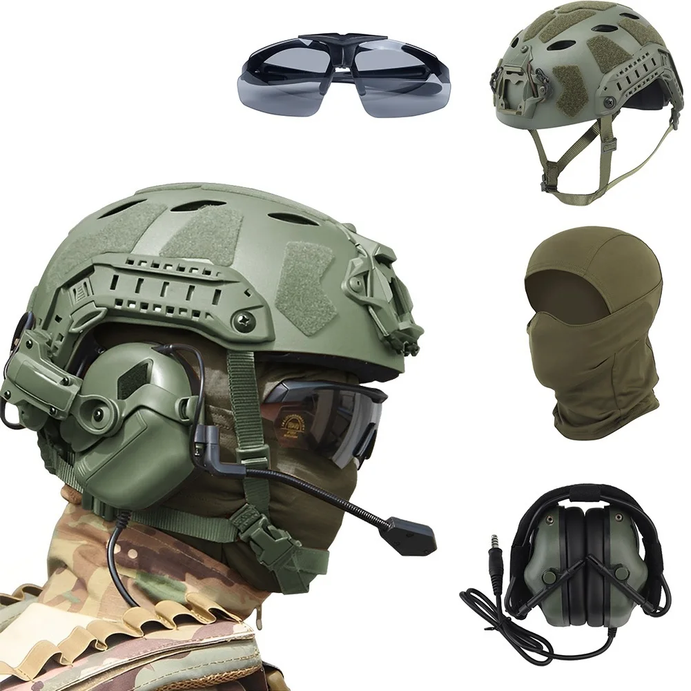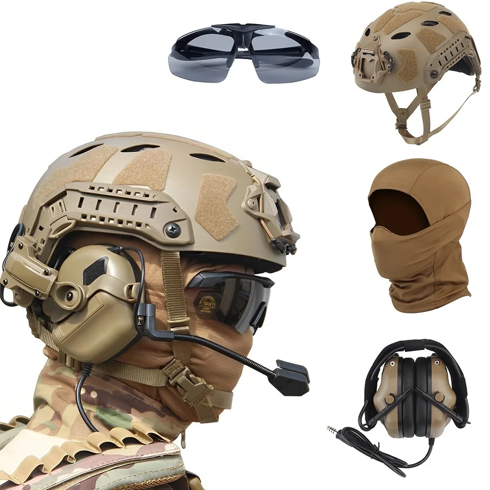 Casco Airsoft, auriculares de comunicación, pasamontañas, mascarilla, juego de gafas de 3 colores Juego de casco táctico de protección total para paintball