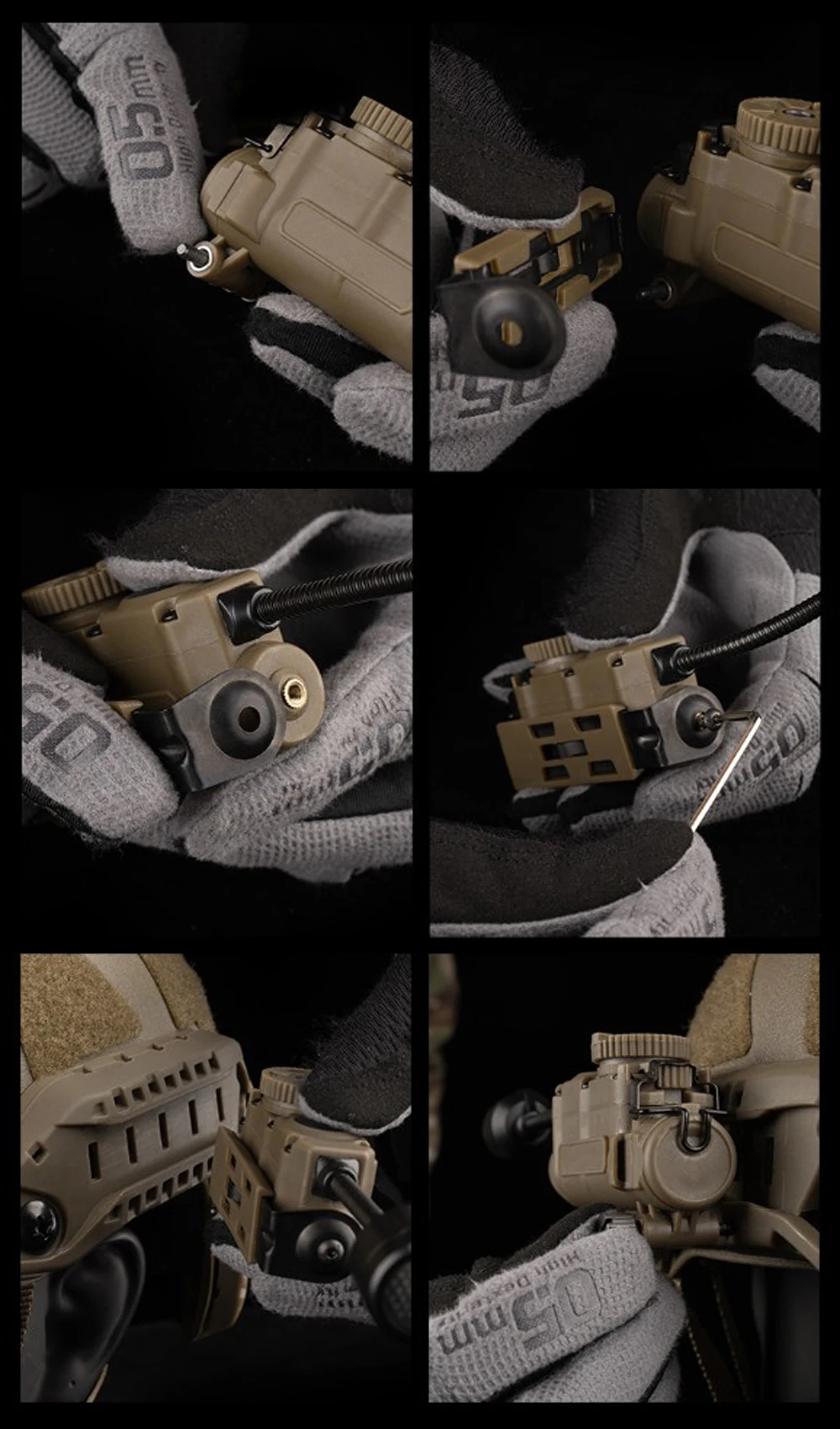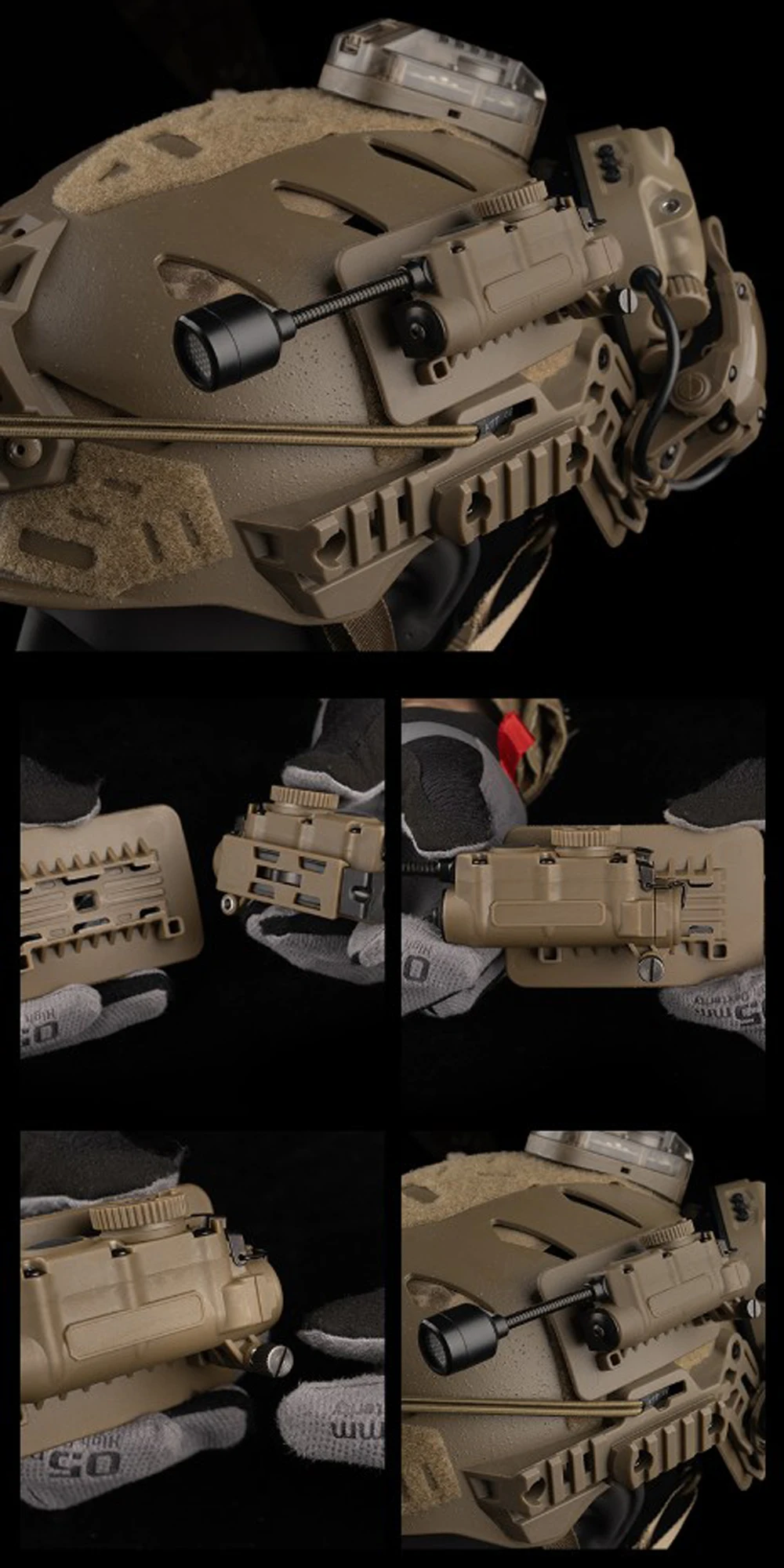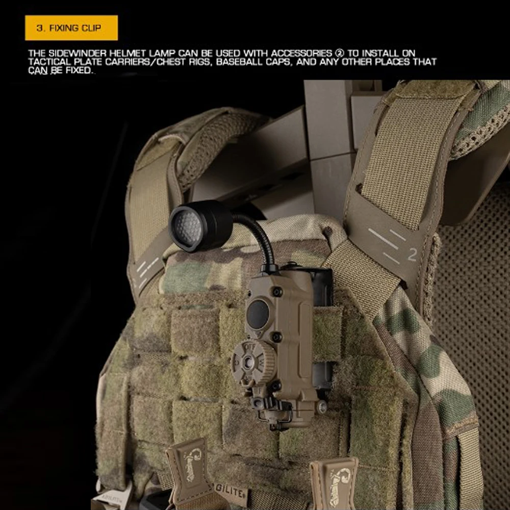Nombre del producto: Lámpara de casco multiusos con enrollador lateral Número de artículo.:LT-11 Tamaño del producto: 16*8,5*5,5 cm Peso neto del producto: 0,08 kg. Peso bruto del producto: 0,206 kg. Color del producto: NEGRO/TAN/VERDE Material principal: nailon Escena aplicable: caza, deportes al aire libre y otros juegos tácticos Airsoft CS, etc.