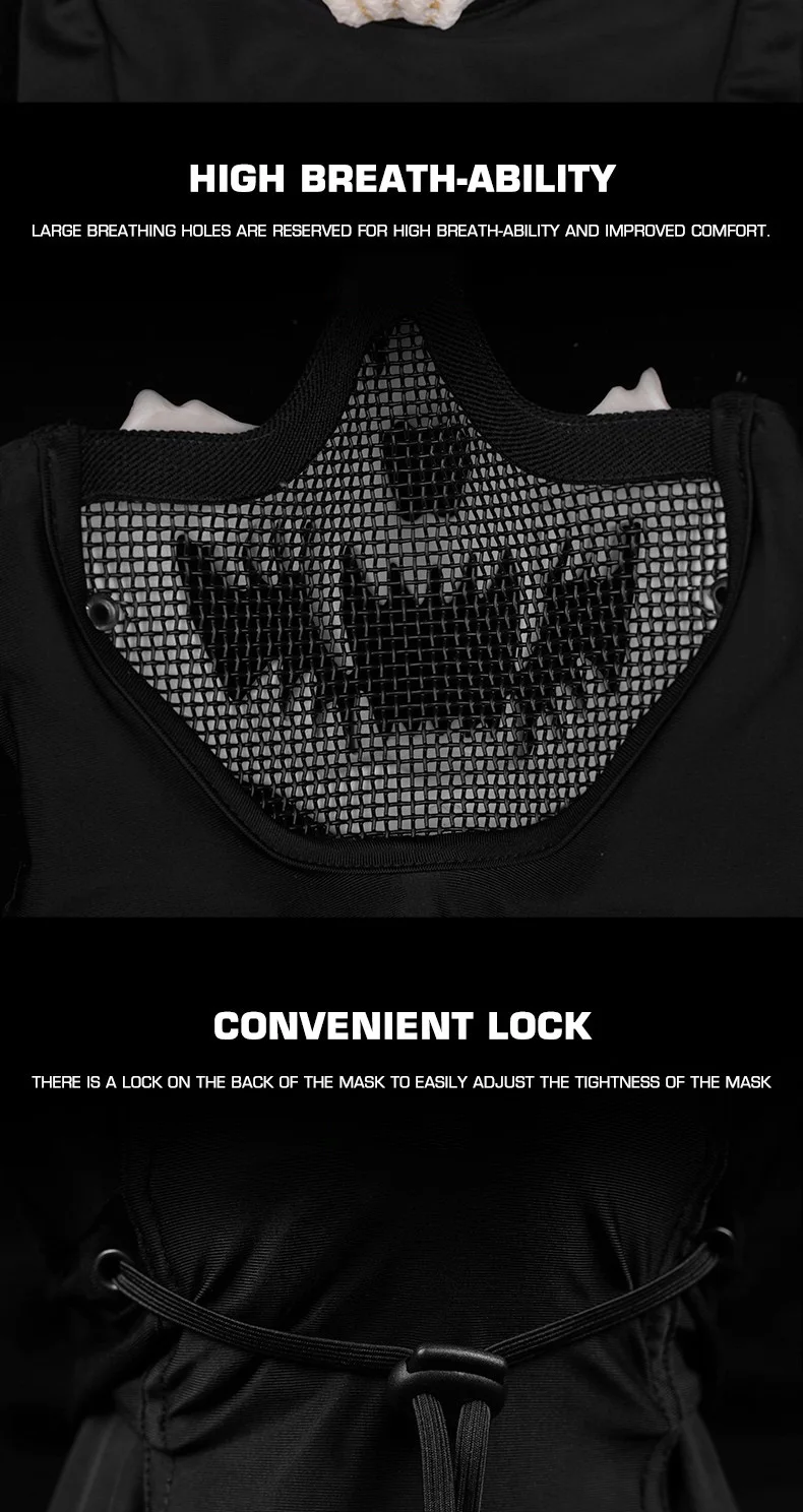 4. Estilo versátil:El diseño adaptable de nuestra máscara de media cara de malla permite una multitud de emparejamientos de moda, lo que permite a los usuarios complementar una amplia gama de Disfraces y prendas para cualquier evento temático o preferencia personal.