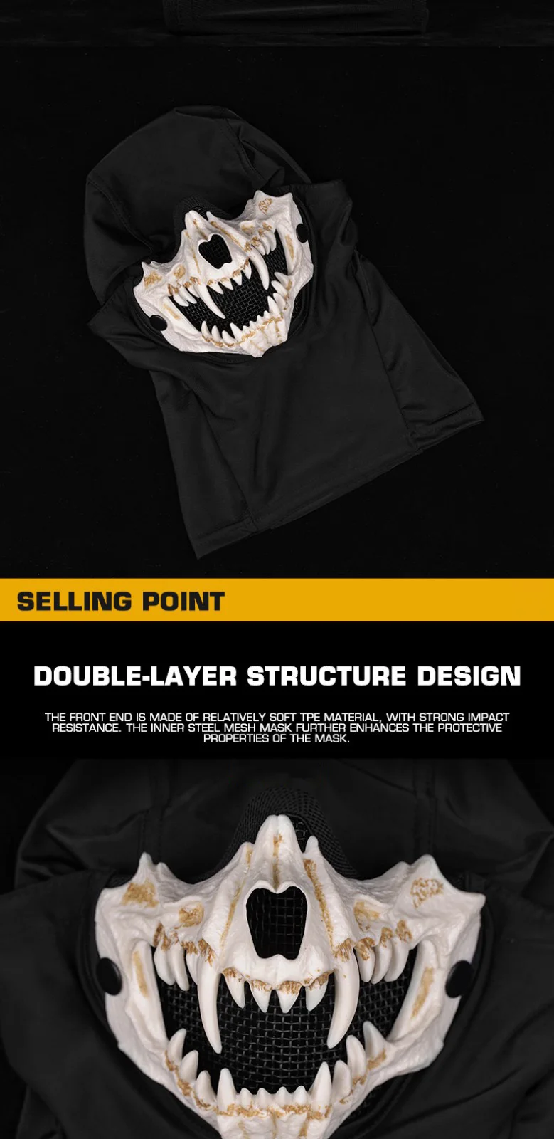 1. Doble capa Robusta:Combinando un frente de TPE suave para la absorción de impactos con una máscara de alambre de acero interior, esta máscara de capucha de malla ofrece una protección incomparable, asegurando que su cara esté protegida con un diseño resistente y de doble estructura.