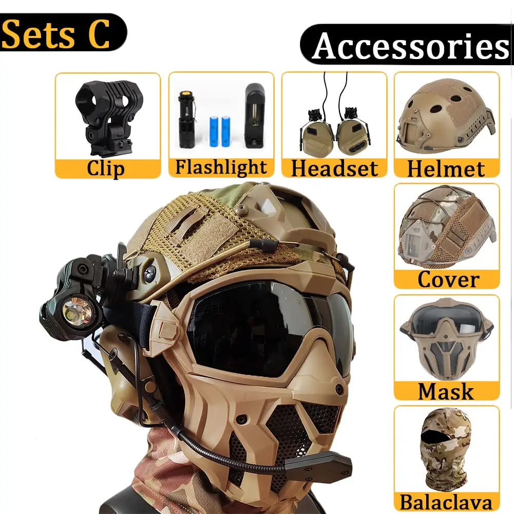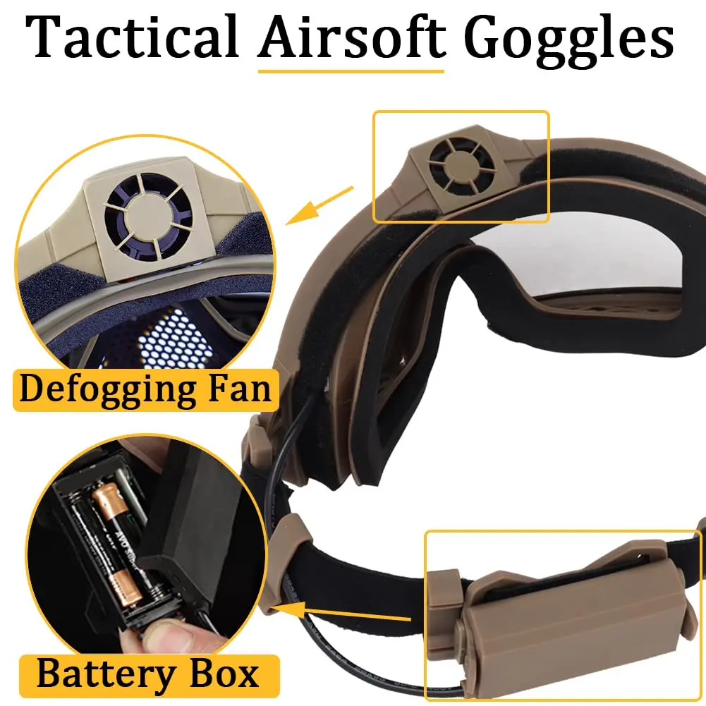 ➤ Gafas tácticas: viene con un ventilador en miniatura para desempañar rápidamente. Hay dos tipos de lentes: negras y transparentes. Resistencia al impacto de las gafas de 350 FPS. Puede resistir perfectamente el paintball y las bombas de agua. ¡Los reproductores BB eligen con cuidado!