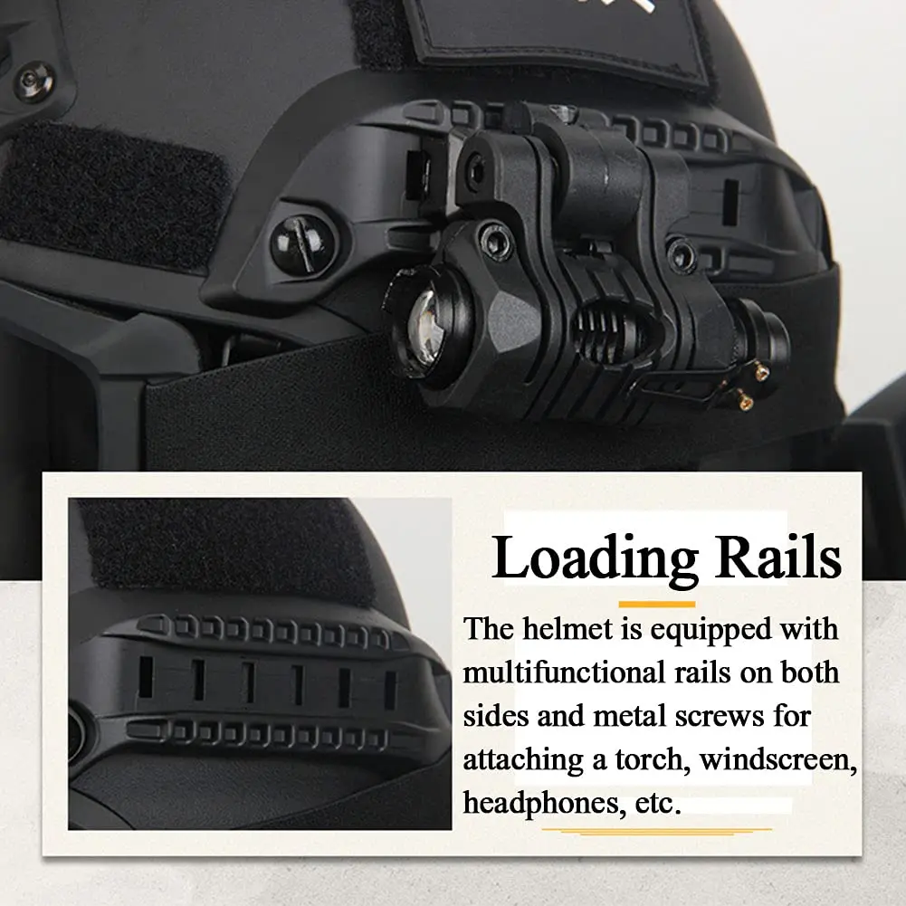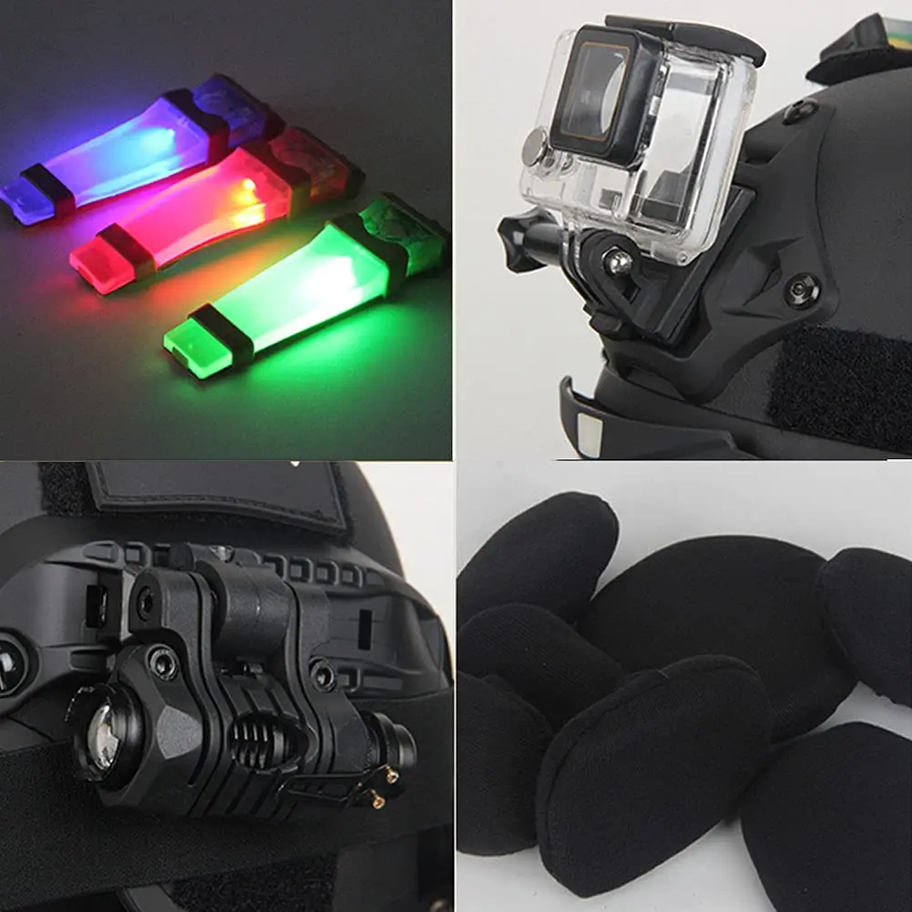 ♥ Los conectores de riel de accesorios proporcionan puntos de fijación que no se enganchan para conectar o liberar rápidamente una variedad de accesorios, incluidos: linternas, cámara, visera, auriculares COM, estroboscópicos, mandíbula, batería... etc.