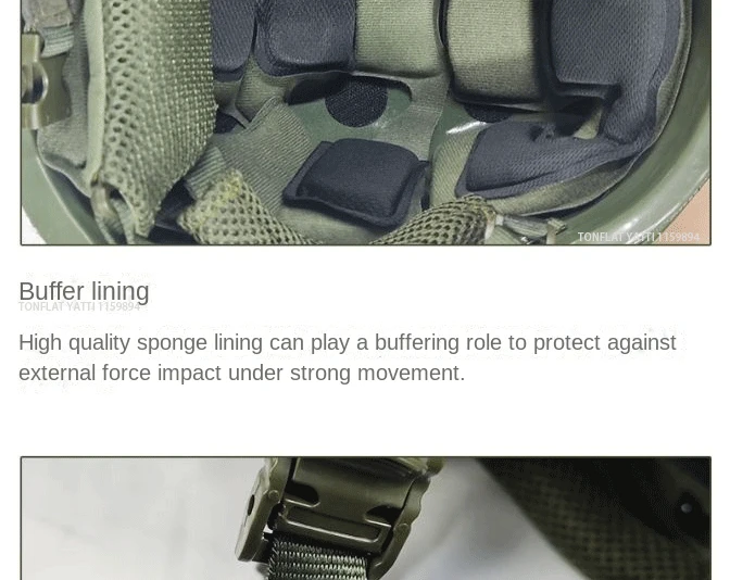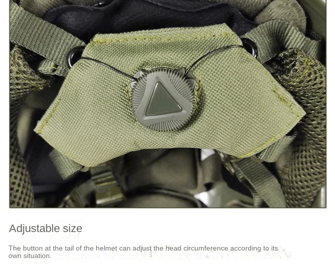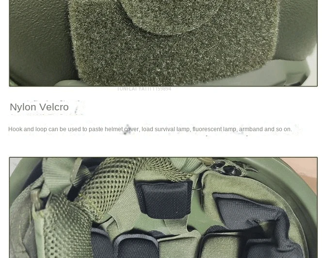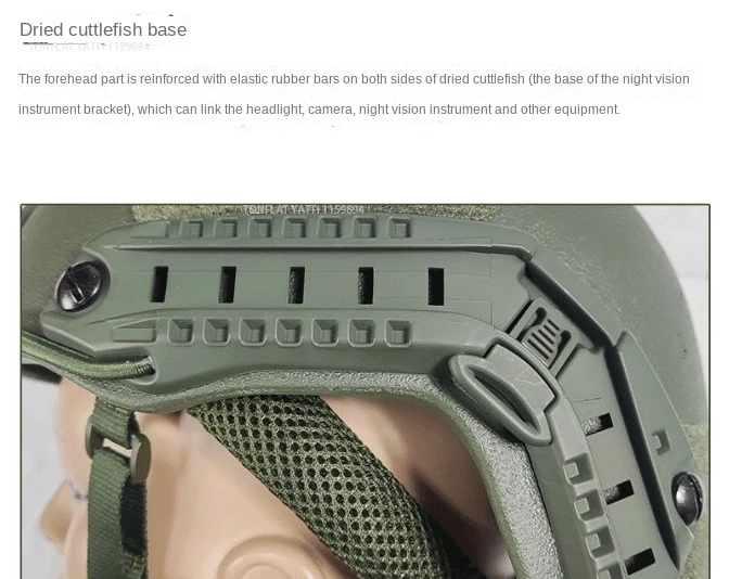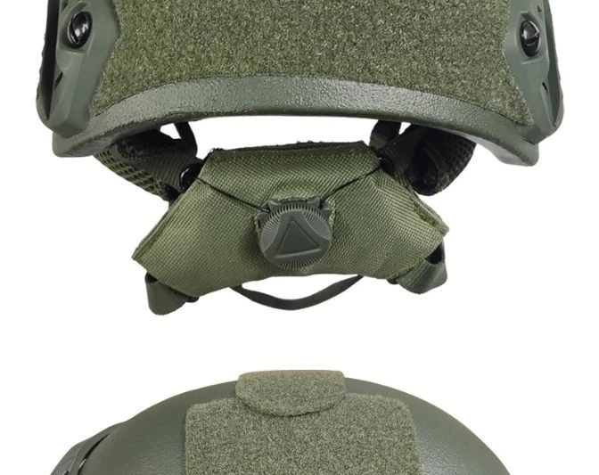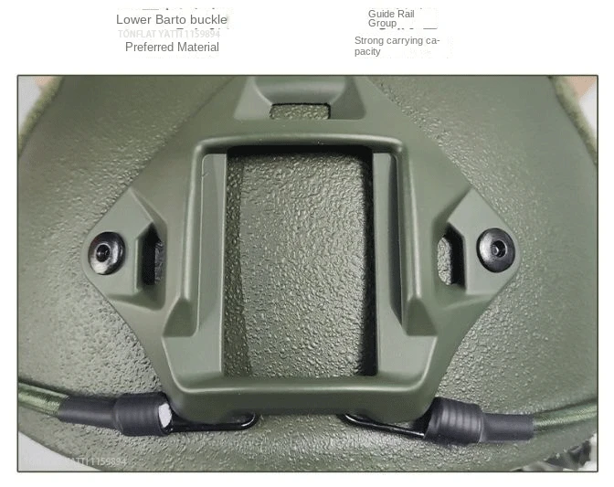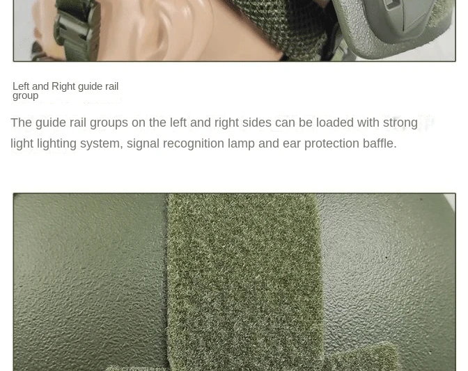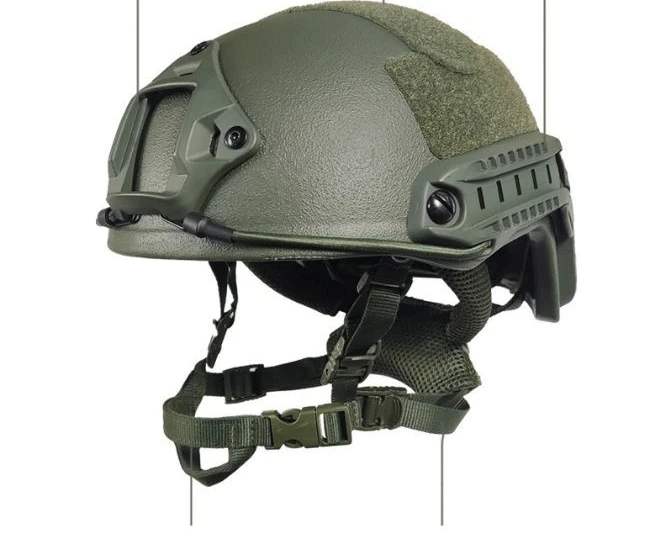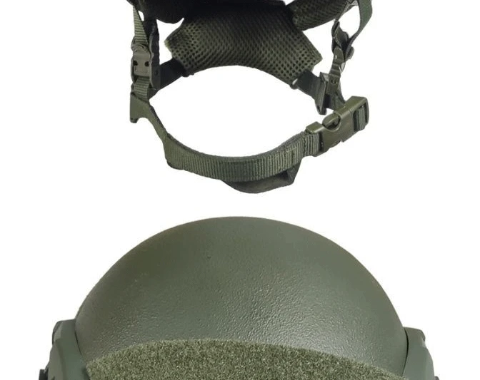 Un casco antibalas consta de una correa para la barbilla en la capa exterior del casco y un sistema de suspensión superior en el casco.Se puede utilizar con auriculares ruidosos.El casco antibalas tiene un sistema ajustable en el interior, que es cómodo de usar y tiene una fuerte función de absorción de impactos.Las barandillas plegables están dispuestas fuera del casco.