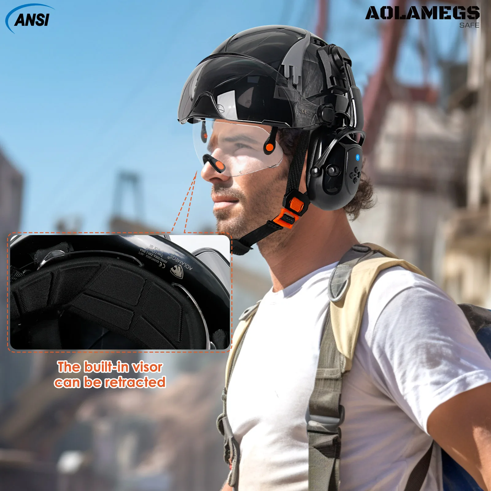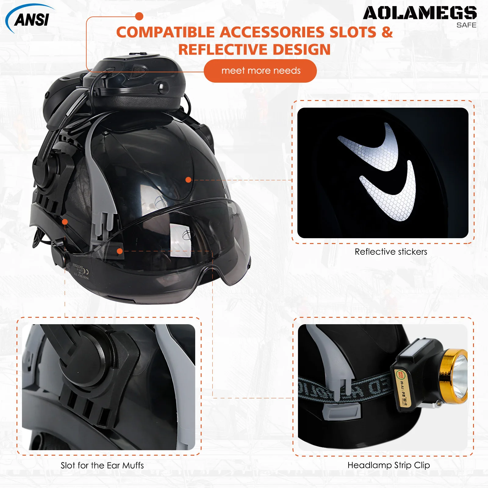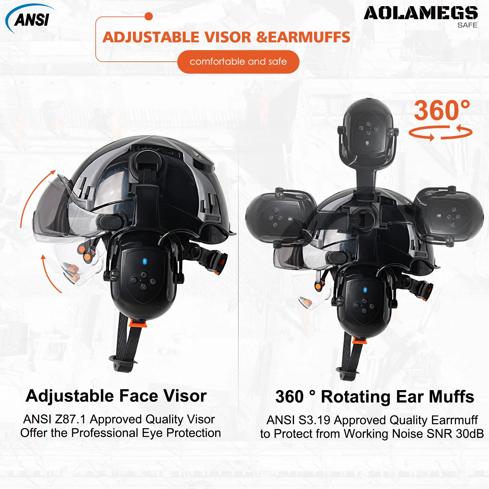 Casco de construcción aprobado por OSHA: este casco de seguridad para cascos de Construccion está hecho de material ABS de alta resistencia, resistente a impactos y penetrante, que es a la vez liviano y resistente.La construcción del casco AOLAMEGS tiene certificación OSHA y cumple con los estándares ANSI Z89.1-2014 tipo C, y la visera del casco cumple con los estándares ANSI Z87.1-2015.Las orejeras cumplen con los estándares: orejeras ANSI S3.19 NRR 23db.