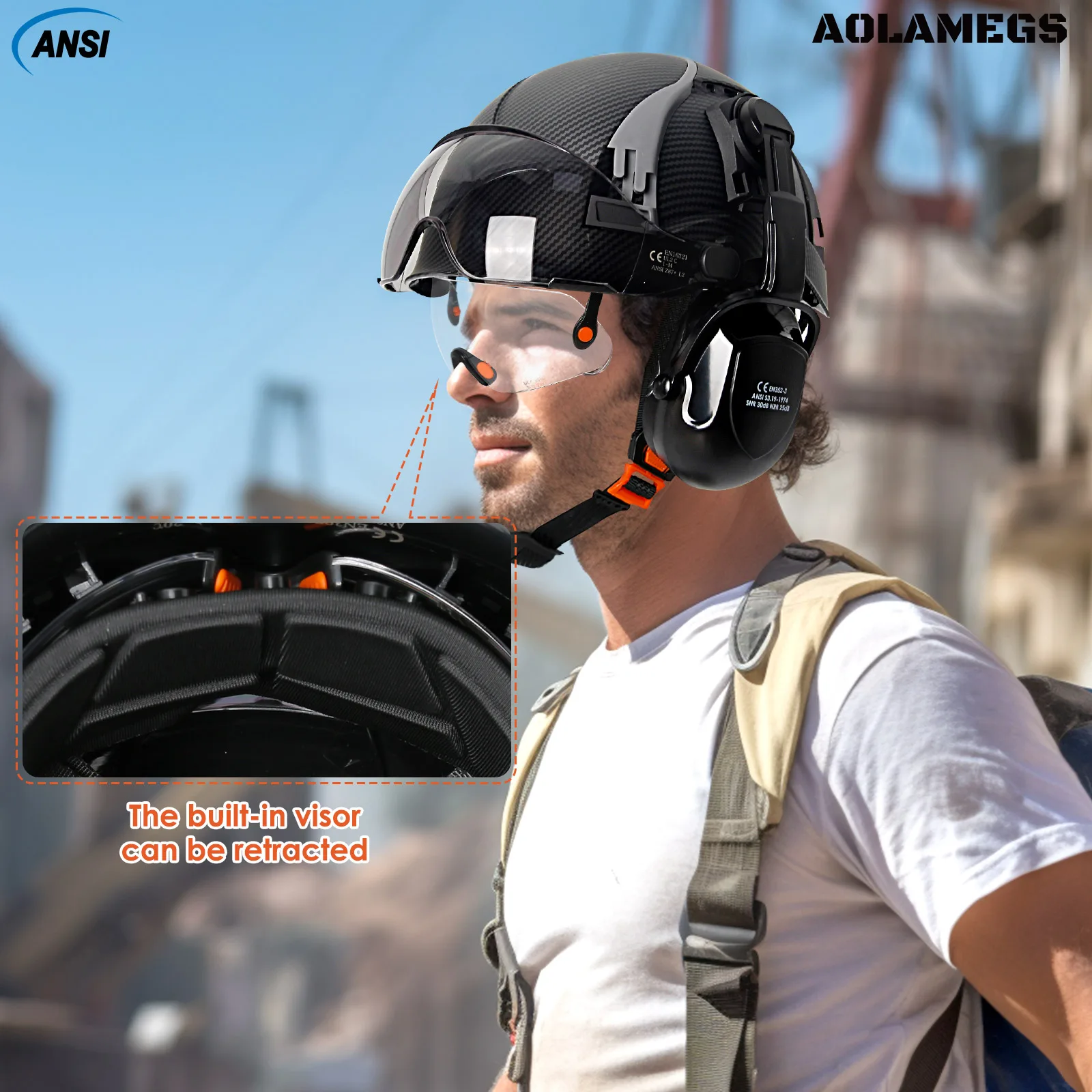 Casco de construcción aprobado por OSHA: este casco de seguridad para cascos de Construccion está hecho de material ABS de alta resistencia, resistente a impactos y penetrante, que es a la vez liviano y resistente.La construcción del casco AOLAMEGS tiene certificación OSHA y cumple con los estándares ANSI Z89.1-2014 tipo C, y la visera del casco cumple con los estándares ANSI Z87.1-2015.Las orejeras cumplen con los estándares: orejeras ANSI S3.19 NRR 23db.