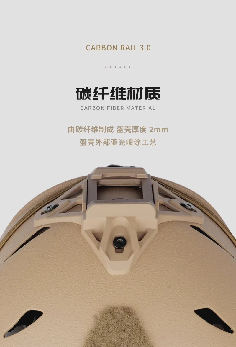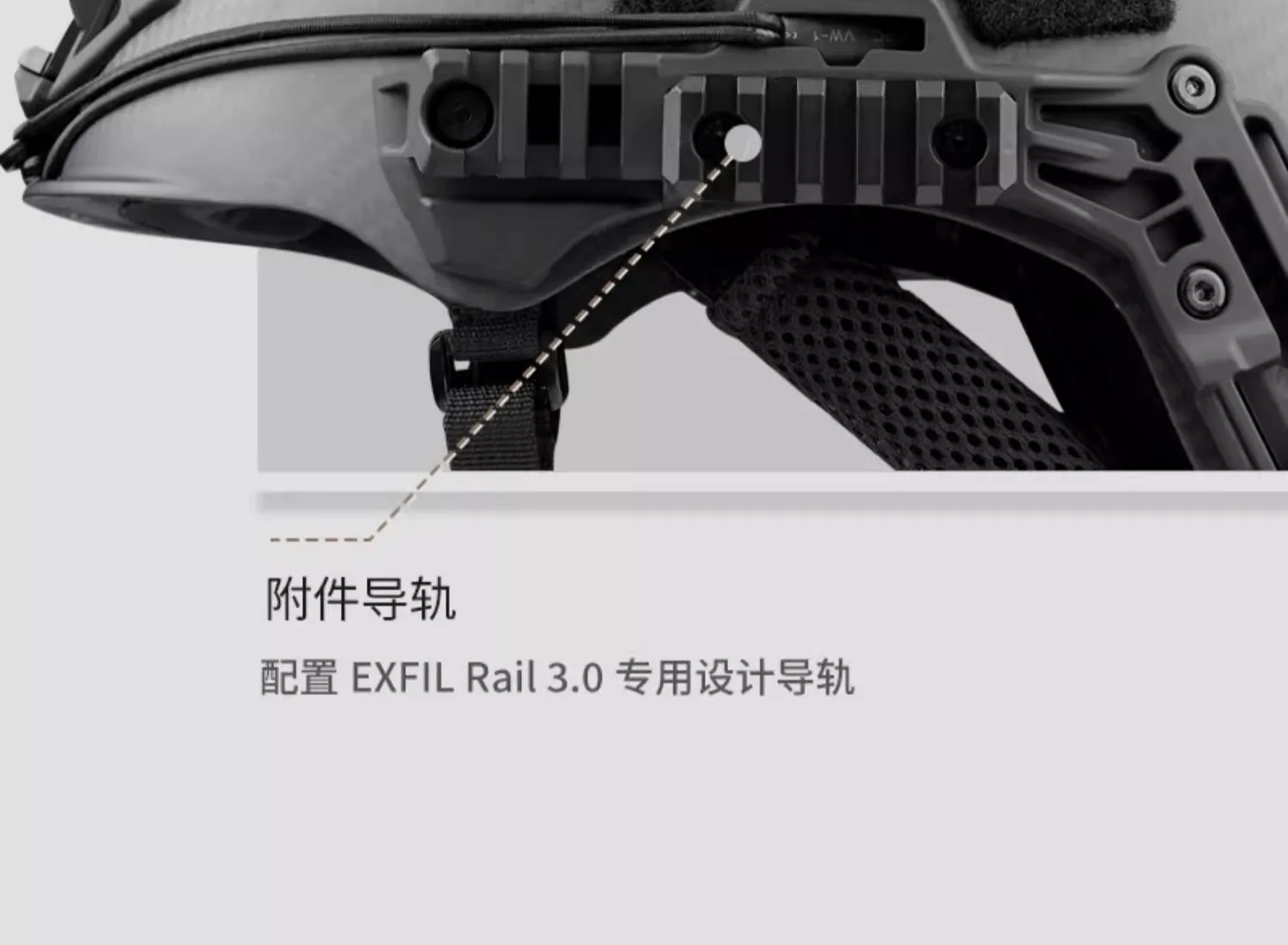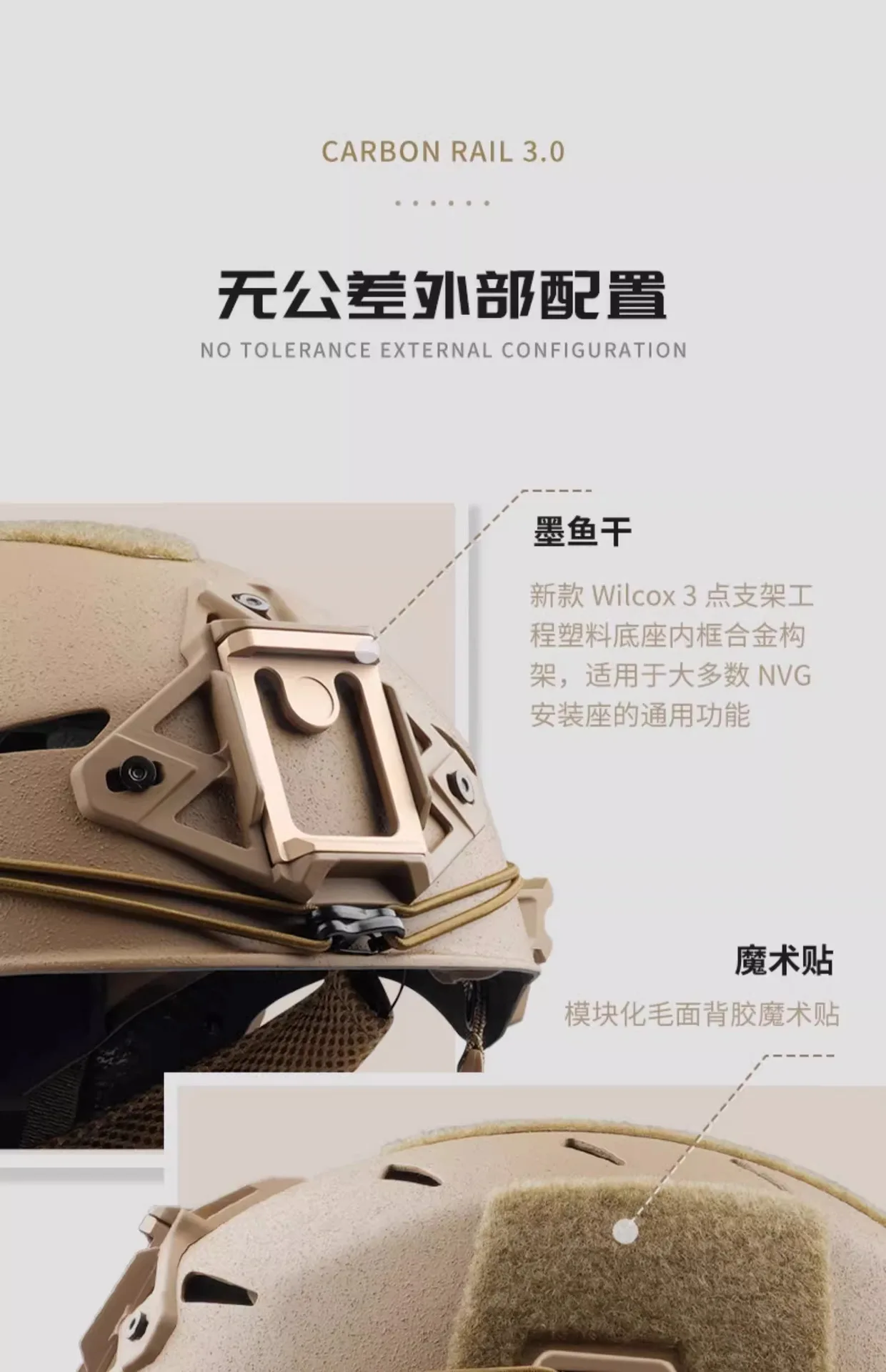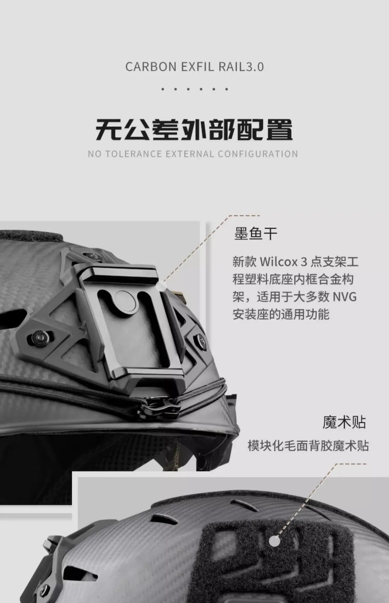 Configuración externa: Equipado con la nueva base de plástico de ingeniería del marco interior de aleación de soporte de 3 puntos Wilcox, adecuada para la función general de la mayoría de los soportes de montaje NVG, riel guía EXFIL Rail 3.0 + velcro adhesivo de superficie rugosa modular externo