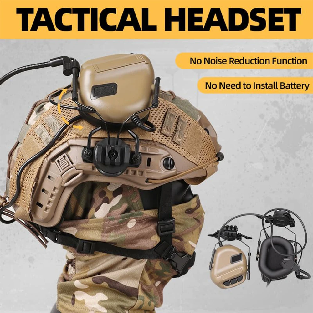 Auriculares tácticos: actividades de expansión, juegos tácticos, accesorios de cine y televisión, actividades de equipo, cosplay y otros deportes al aire libre.***TENGA EN CUENTA: Requiere su uso con PTT, los soportes de riel de este auricular solo son adecuados en cascos de tipo rápido con rieles laterales. Esta versión solo tiene función de comunicación, sin función de reducción de ruido.