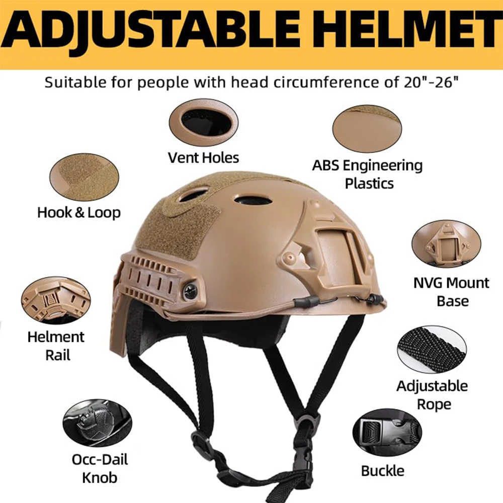 Casco táctico ajustable: hecho de material plástico de ingeniería ABS de 3,5 mm, liviano y resistente, el peso es de 1,6 libras, adecuado para un uso prolongado, adecuado para una circunferencia de cabeza de 20,2 a 26 pulgadas.