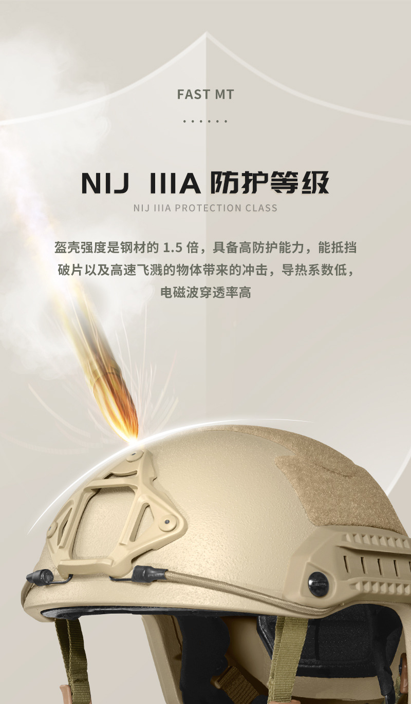 La carcasa del casco tiene una resistencia 1,5 veces mayor que la del acero, lo que ofrece altas capacidades de protección.Puede soportar el impacto de fragmentos y salpicaduras de objetos a alta velocidad, tiene una baja conductividad térmica y una alta tasa de penetración de ondas electromagnéticas.