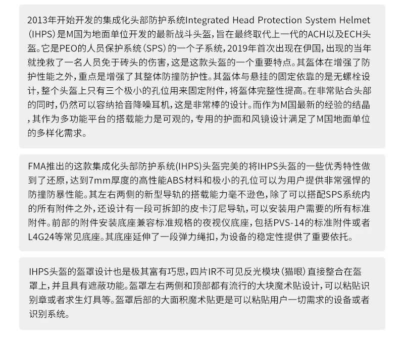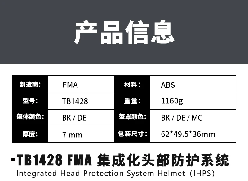 Lista de paquetes: 1 Uds. CascoAjuste dentro de una circunferencia de la cabeza de 62 cm.Material: ABS.Peso: 1160 gramosColor del casco: BK/DEColor de la funda del casco: BK/DE/MC (tres colores opcionales)Espesor: 7 mmDescripción:1, el último casco de combate, con la función de impacto ligero y absorción de energía de impacto, es la base de la confiabilidad de todo el sistema de interferencia de la cabeza.7 mm de espesor.2, la base del adaptador multifunción (seppie seco de metal) se puede instalar una conexión del adaptador fija, como un faro, una cámara, un instrumento de visión nocturna y otros equipos conectados3, especialmente equipado con riel guía tipo V, diseño de forma especial, con dos piezas pequeñas deslizantes, puede soportar la transferencia y conectar otros equipos (como faros, linternas, gafas, equipos de comunicación, cámaras y otros accesorios)4.Suspensión de almohadilla tipo X, el ajuste de cuatro puntos es más cómodo y estable, y la hebilla de ajuste elástica puede resolver eficazmente el problema de que el cinturón de casco tradicional es fácil de soltar después de usarlo durante un período de tiempo.5, almohadilla protectora tradicional, almohadilla protectora de esponja viscoelástica, rebote rápido, suave y cómoda, compuesta por 8 piezas de almohadilla de algodón.6.La cubierta de llenado tipo gancho protege el cuerpo de relleno y resalta la estabilidad del relleno del cabezal.Hay 4 bloques de reconocimiento reflectantes ocultos en la superficie de la cubierta de relleno, que se pueden abrir cuando se usa.Multifacéticobucle de gancho, alta resistenciabucle de gancho, bucle de ganchopuede equiparse con personalidadbucle de ganchoy luces de reconocimiento IR y otros accesorios según la demanda, el bucle de gancho multiángulo completo puede hacer que sus accesorios se peguen en el lugar que necesite.
