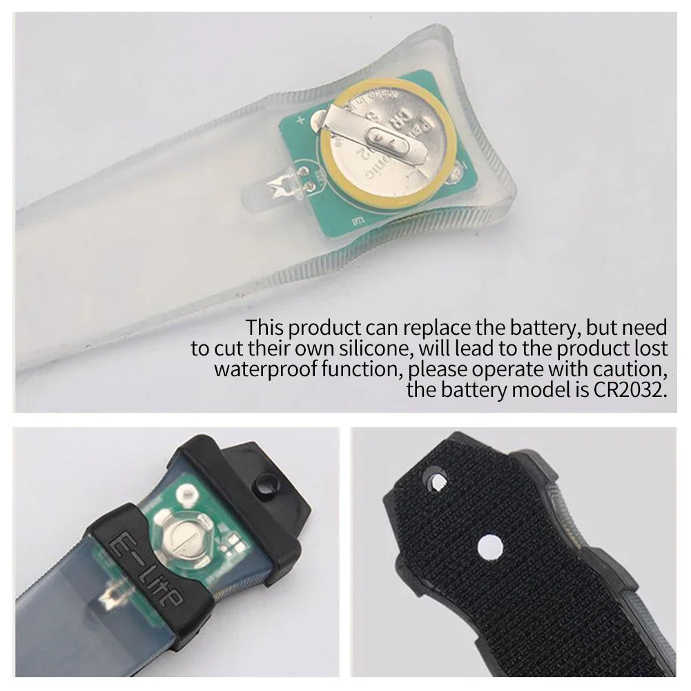 Batería de botón CR2032: puede durar una semana en modo estable y un mes en modo intermitente (el tiempo real variará según la temperatura ambiente). La batería se puede reemplazar por sí misma después de su uso, pero debe reemplazarse cortando la silicona, Para perder la envoltura impermeable y prestar atención al borde de la batería para evitar el contacto entre los electrodos positivo y negativo.