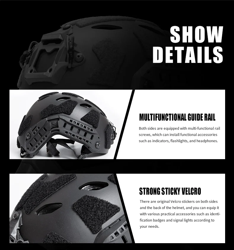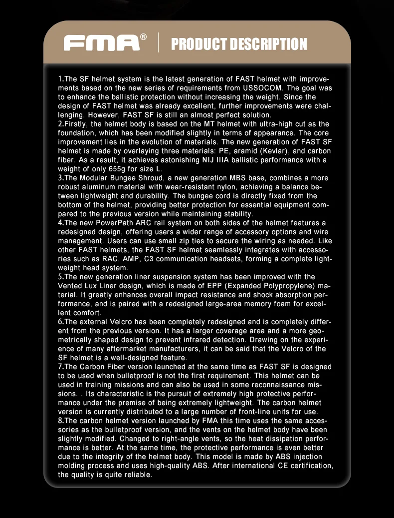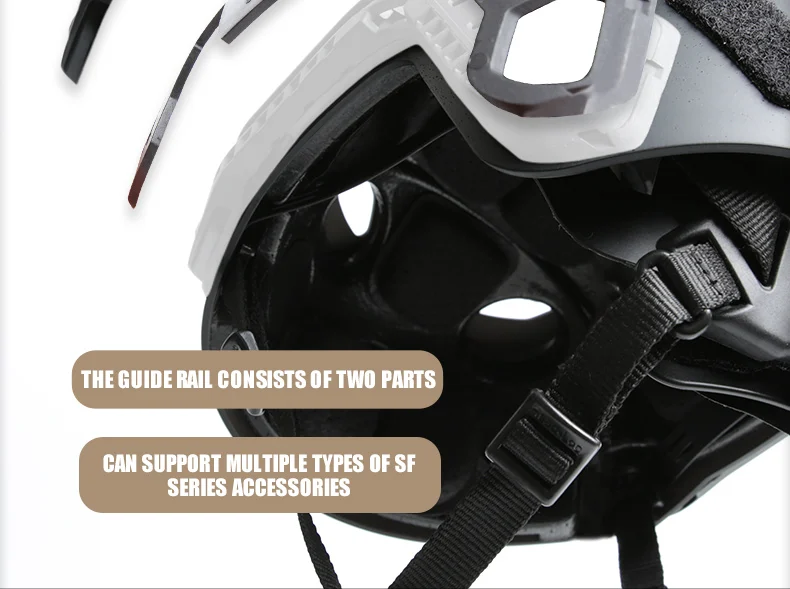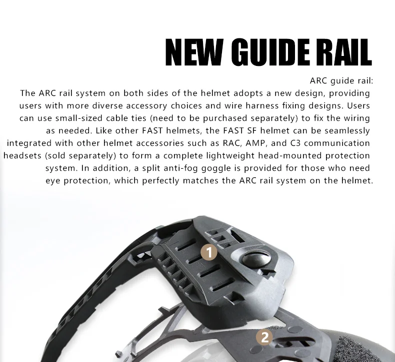El Sistema de riel de guía ARC en ambos lados del casco adopta un nuevo diseño, proporcionando a los usuarios una selección más diversa de accesorios y diseño de fijación del arnés de cableado. Los usuarios pueden colocar pequeñas correas de amarre según sea necesario (se comprarán por separado) para asegurar el cableado. Al igual que otros cascos FAST, los cascos FAST SF pueden integrarse perfectamente con otros accesorios de casco como auriculares de comunicación RAC, AMP, C3 (a comprar por separado), formando un sistema de protección de cabeza ligero completo. Además, para aquellos con necesidades de protección ocular, también se proporcionan gafas antiniebla de tipo dividido, que se adaptan perfectamente al sistema de rieles ARC del casco.