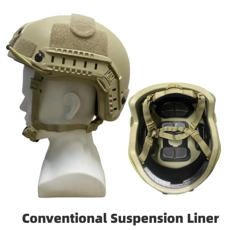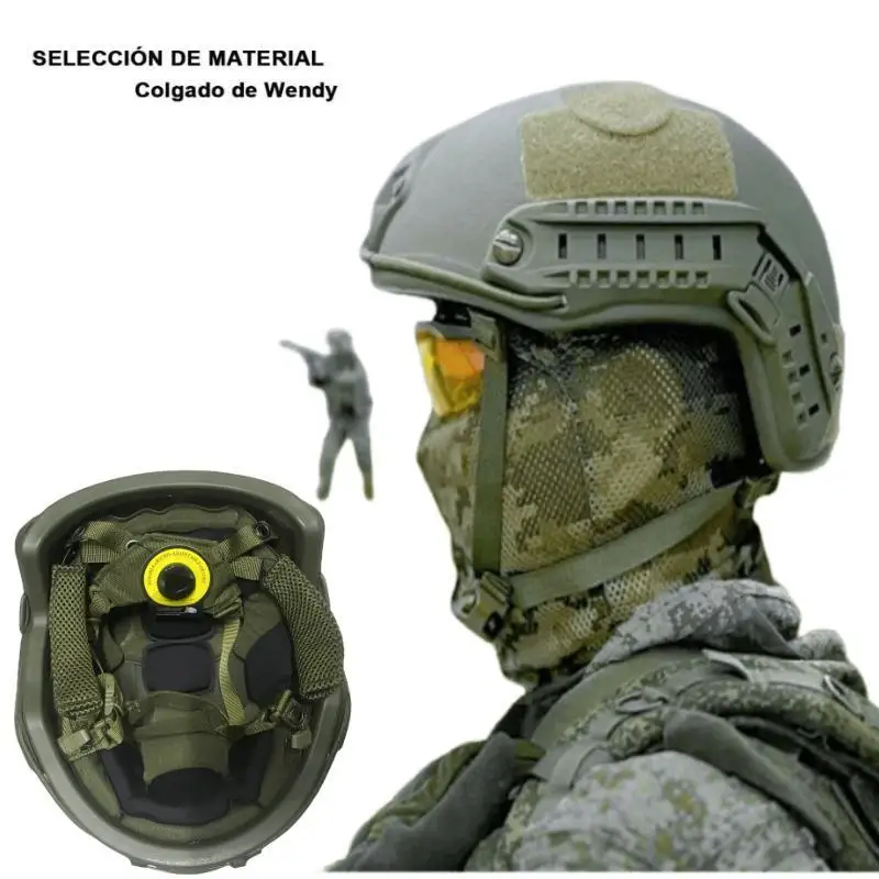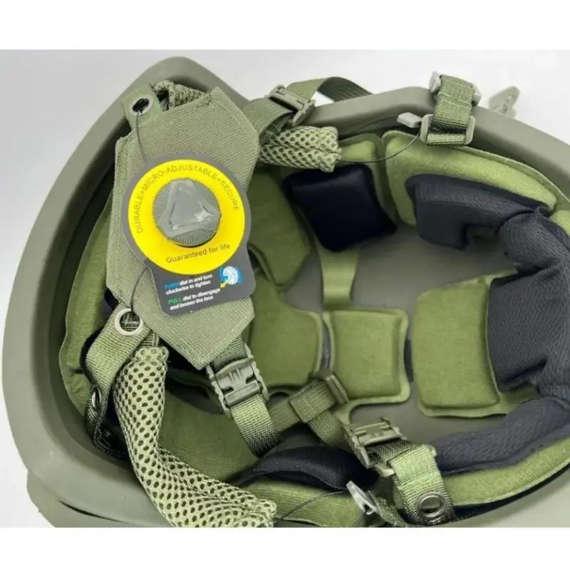 Este casco balístico consta de una correa para la barbilla del casco y un sistema de suspensión superior del casco.