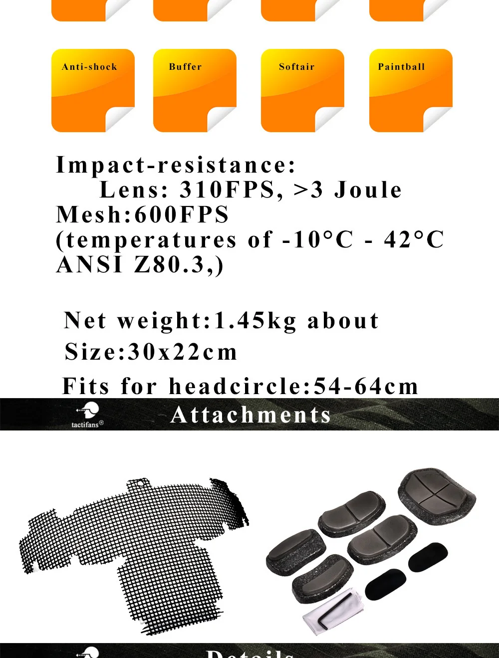 Tamaño del producto: 30*22cmSerie de productos: CascoCircunferencia de cabeza adecuada: 54cm-64cmEscena aplicable: varias actividades al aire libreAccesorios del producto: Casco, lente de PC y lente de malla de acero, juego de almohadillasPeso del producto: 1,5 kg aproximadamenteEmbalaje del producto: caja