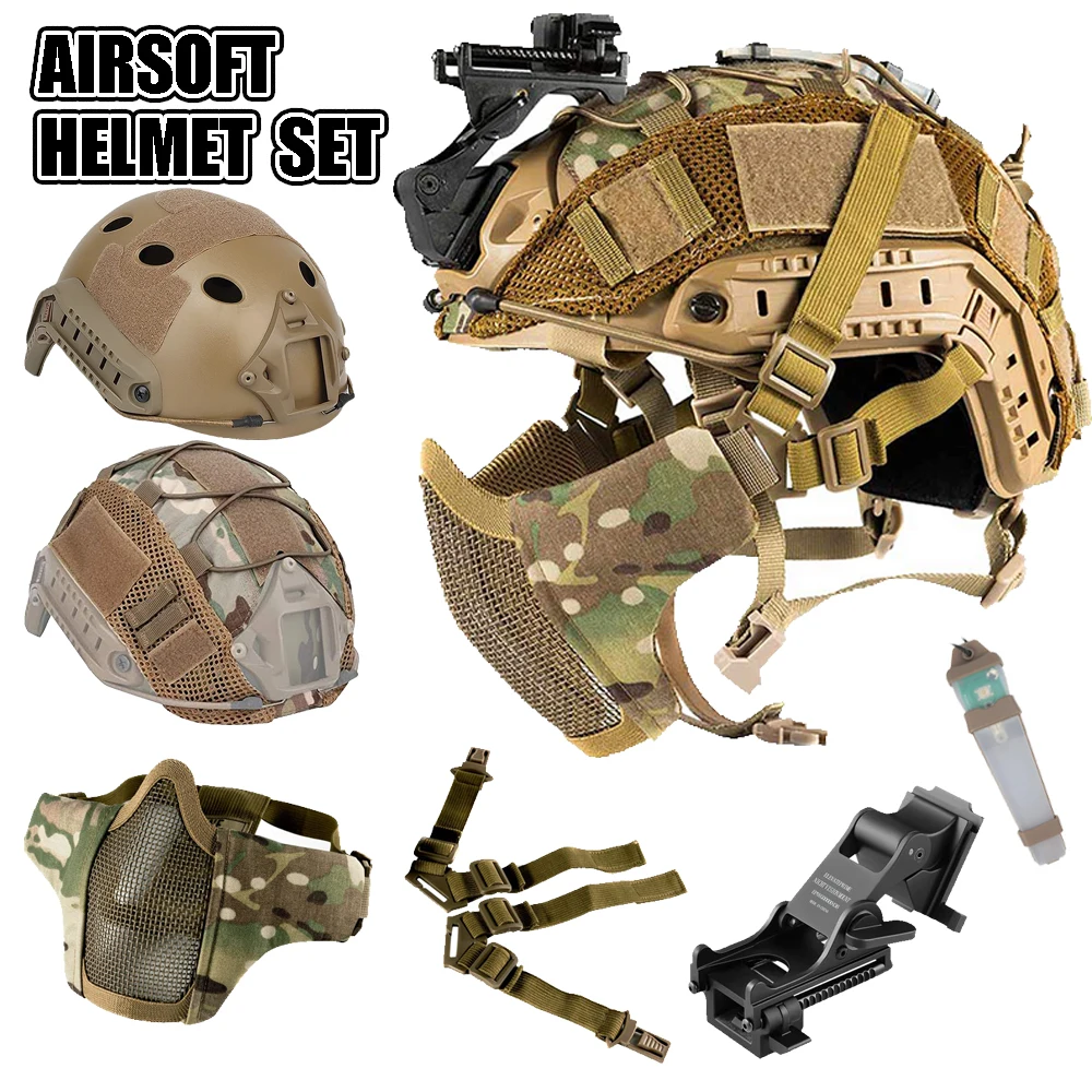 Casco táctico rápido de 6 ", conjunto de máscara de malla plegable de media cara, casco de montaje NVG PVS-14, lámpara de señal de supervivencia, equipo de caza Airsoft