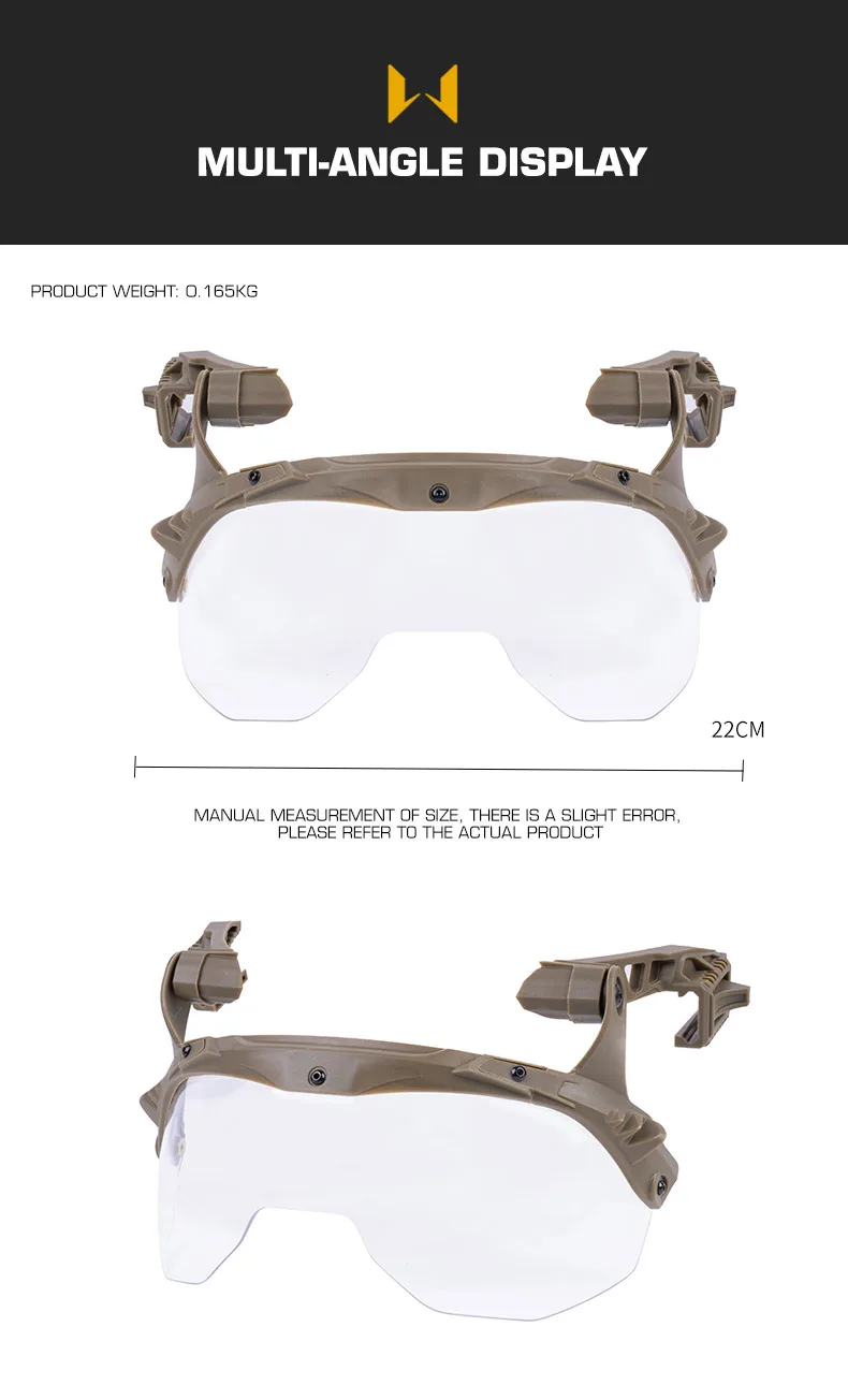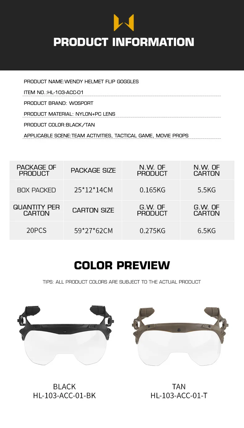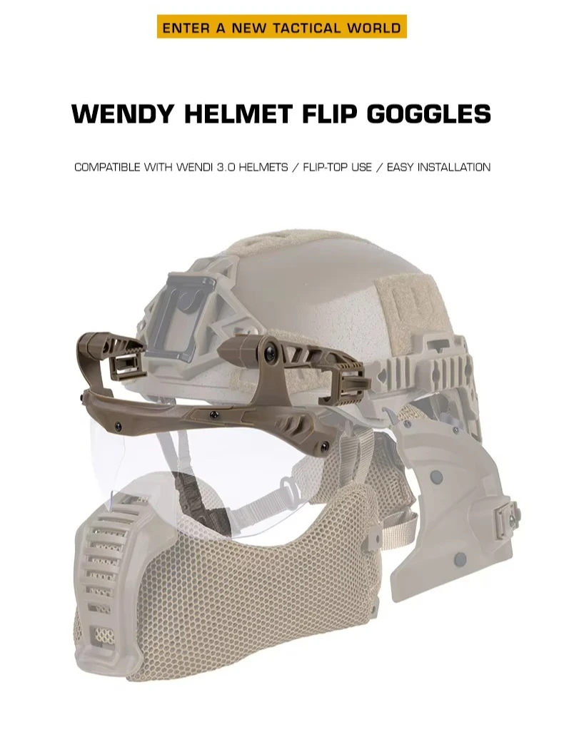 Gafas abatibles para casco compatibles con cascos Wendy 3.0 para accesorios para cascoInformación del producto Nombre del producto: gafas abatibles para casco Wendy Artículo No.:HL-103-ACC-01 Material del producto: lente de nailon + PC. Color del producto: negro/tan Escena aplicable: actividades de equipo, juegos tácticos, accesorios de película.