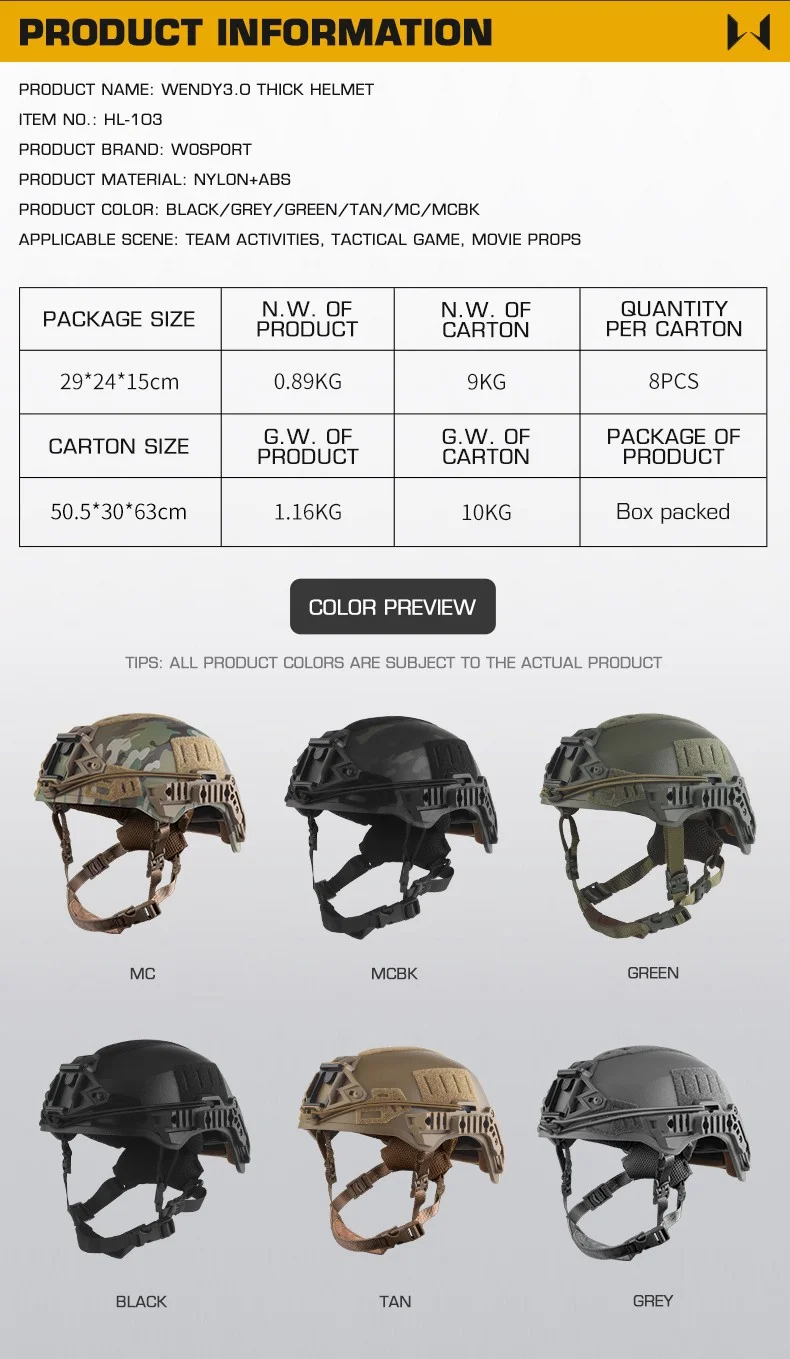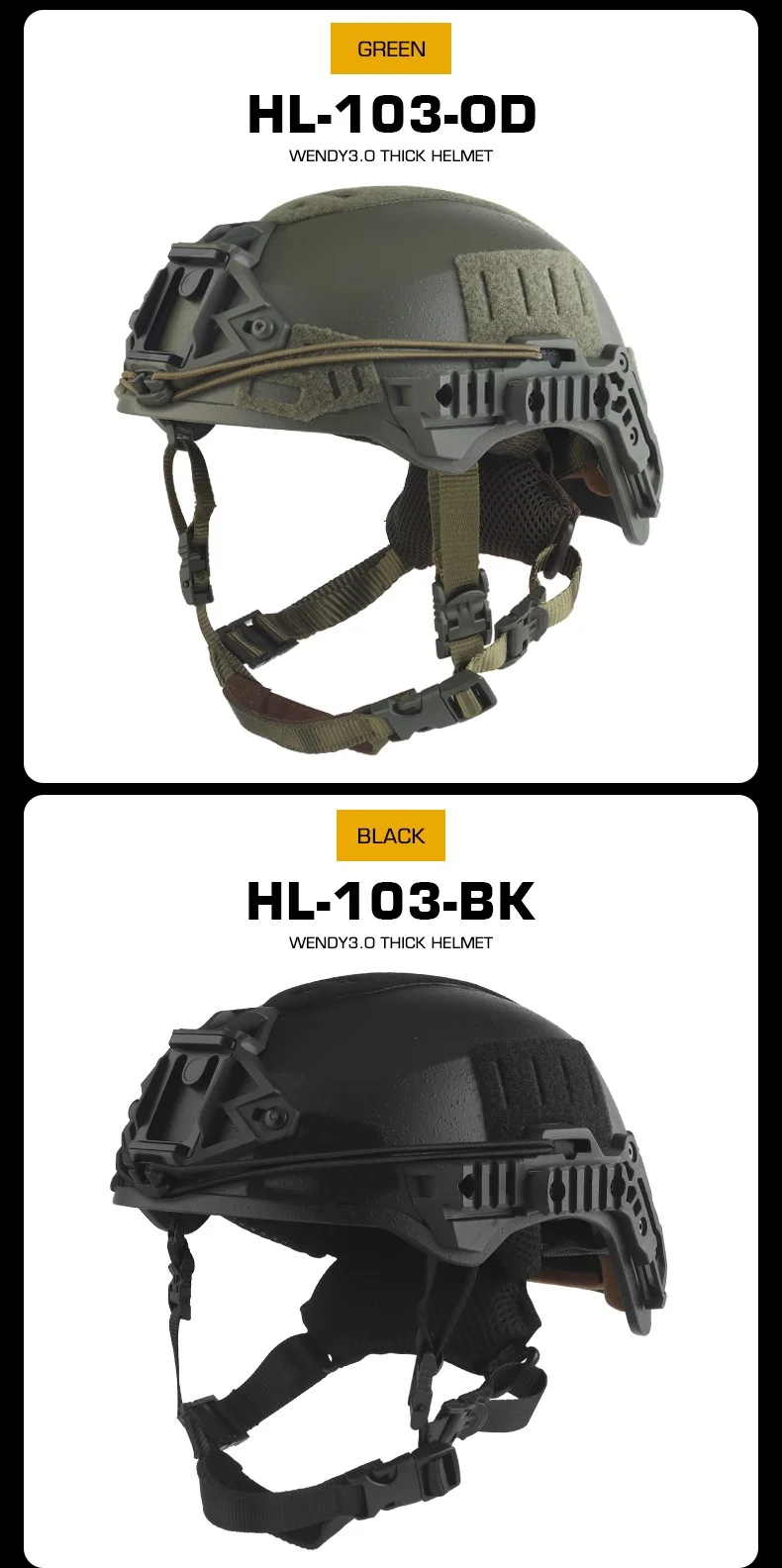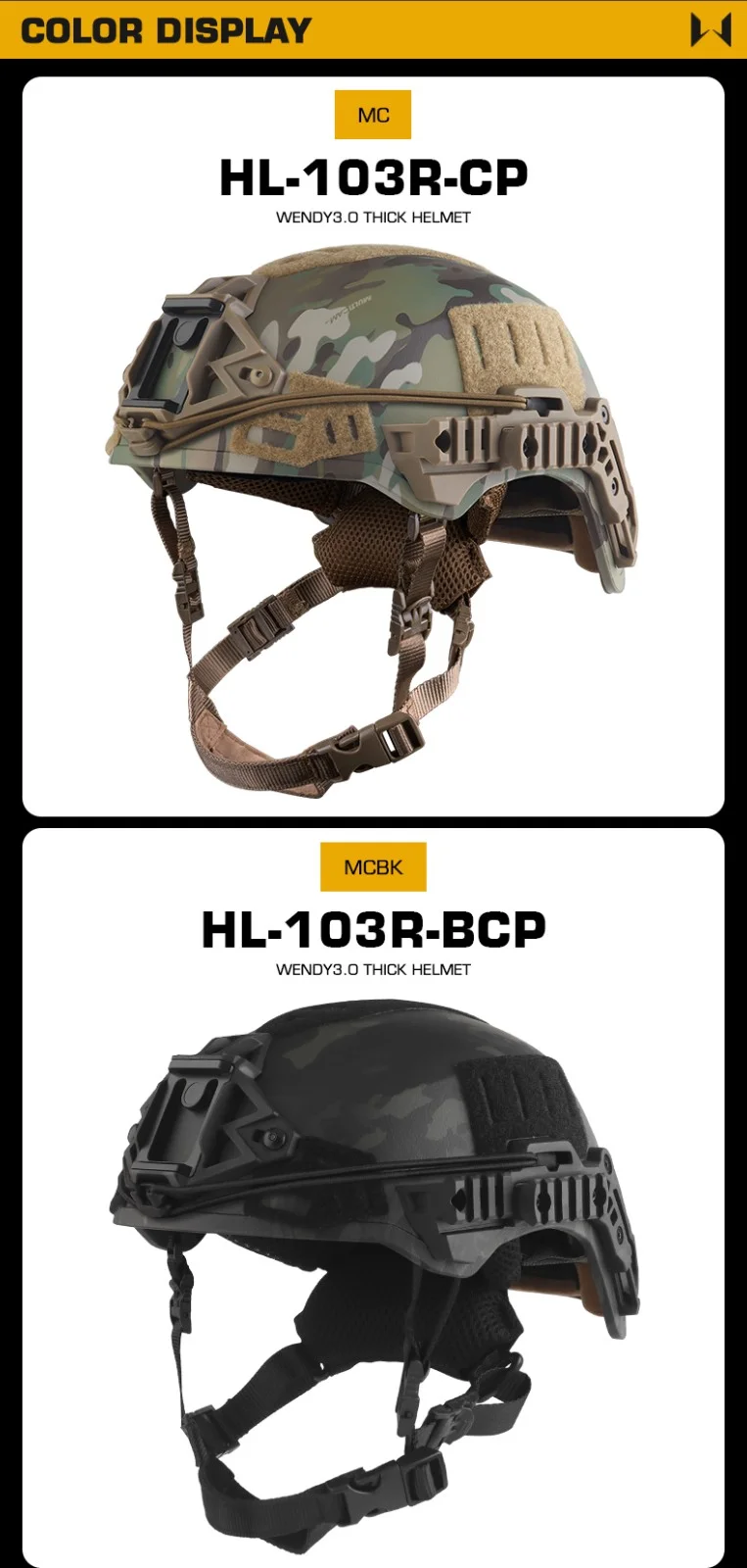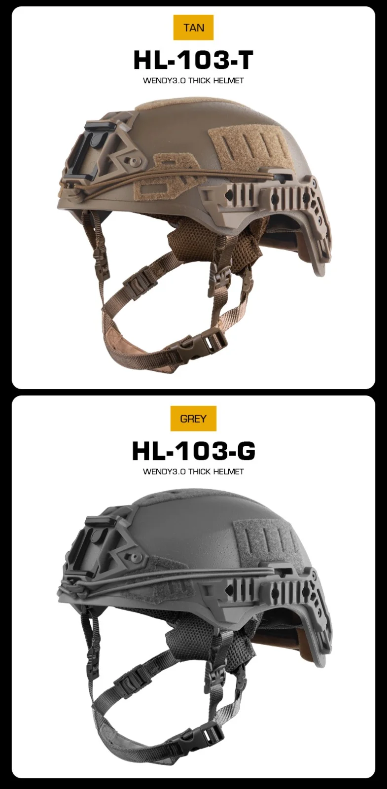 Nombre del producto: casco grueso Wendy3.0 Número de artículo.:HL-103 Tamaño del producto: 29*24*15cm Peso neto del producto: 0,89 kg. Peso bruto del producto: 1,16 KG Color del producto: Negro/Gris/Verde/Tan/Multicam/Multicam Negro Circunferencia de la cabeza adecuada: 56-60 cm Material principal: nailon ABS. Escena aplicable: caza, deportes al aire libre y otros juegos tácticos de Airsoft, etc.