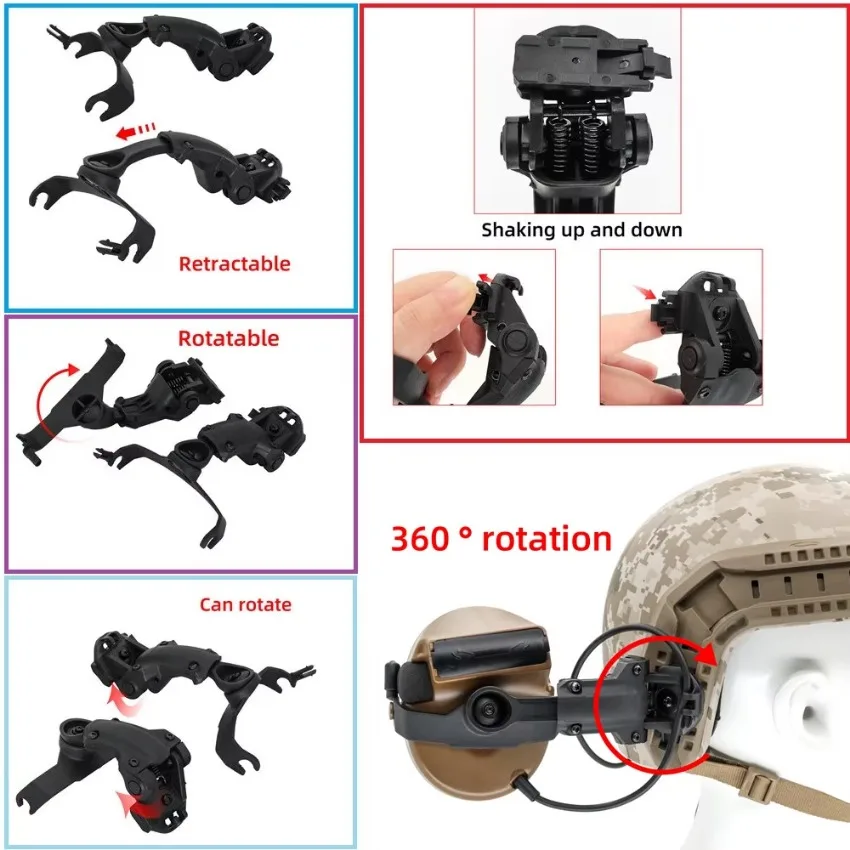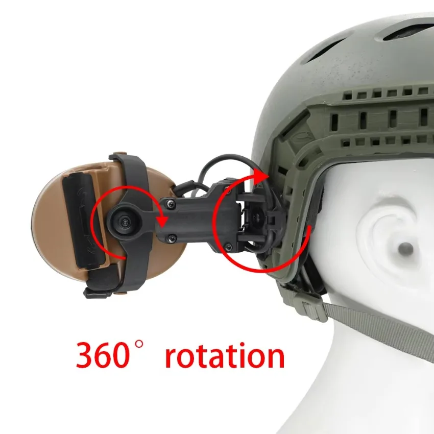 El adaptador de riel del soporte de este auricular es la pista central para casco ARC OPS. El adaptador de riel se puede utilizar para toda la gama de cascos FAST, cascos ACH, cascos MICH y otros cascos con rieles ARC en los laterales.Este adaptador de riel para casco ARC puede girar 360° y muévete hacia arriba y hacia abajo.La ranura para tarjetas en el soporte para auriculares también se puede girar.La longitud del soporte también se puede ajustar.