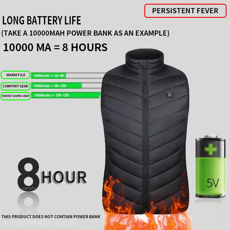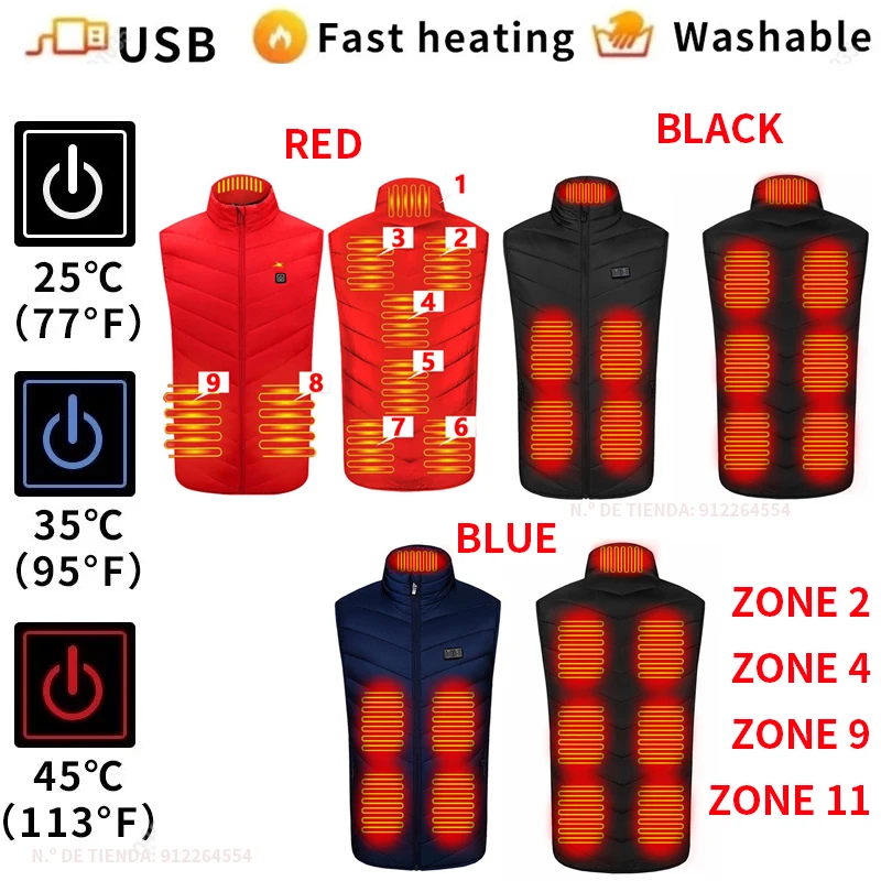 Tamaño: S/M/L/XL/2XL/3XL/4XL/5XL. El paquete incluye: 1 Chaleco calefactable (no incluye energía móvil). Instrucciones de lavado: 1. Saca el cargador extraíble.