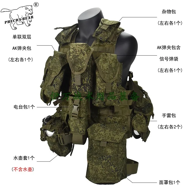 Un conjunto de productos relacionados incluye: 1 cuerpo de chaleco;2 bolsas pequeñas de basura, 4 bolsas SL pequeñas, 2 bolsas dobles individuales AK;2 bolsas de almacenamiento de bolsa AK simples doble + XHD;1 funda para botella de agua (sin botella de agua);1 paquete de radio;1 paquete de mascarillas y 1 paquete de asalto de 7 litros;