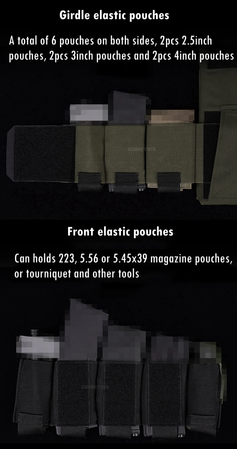 ● Bolsas elásticas frontales. Puede contener bolsas de 223, 5,56 o 5,45x39 para revistas, torniquetes y otras herramientas.
