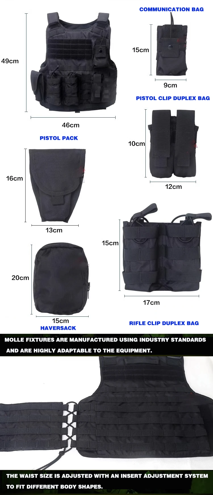 Accesorios: Cuerpo del chaleco *1, bolsa dúplex con clip para rifle *1, bolsa dúplex con clip para pistola *1, bolsa de comunicación *1, bolsa para pistola *1, bolsa para diversas *1
