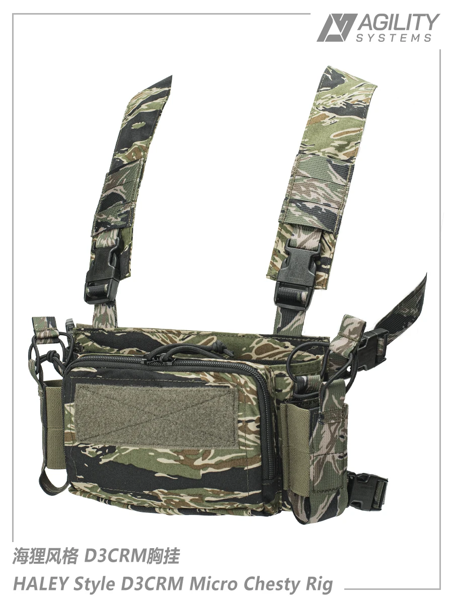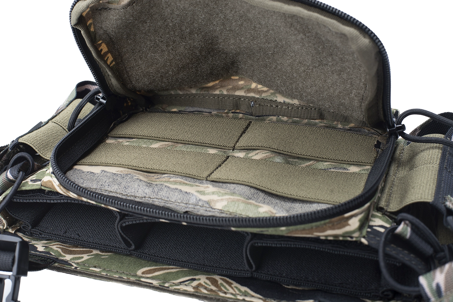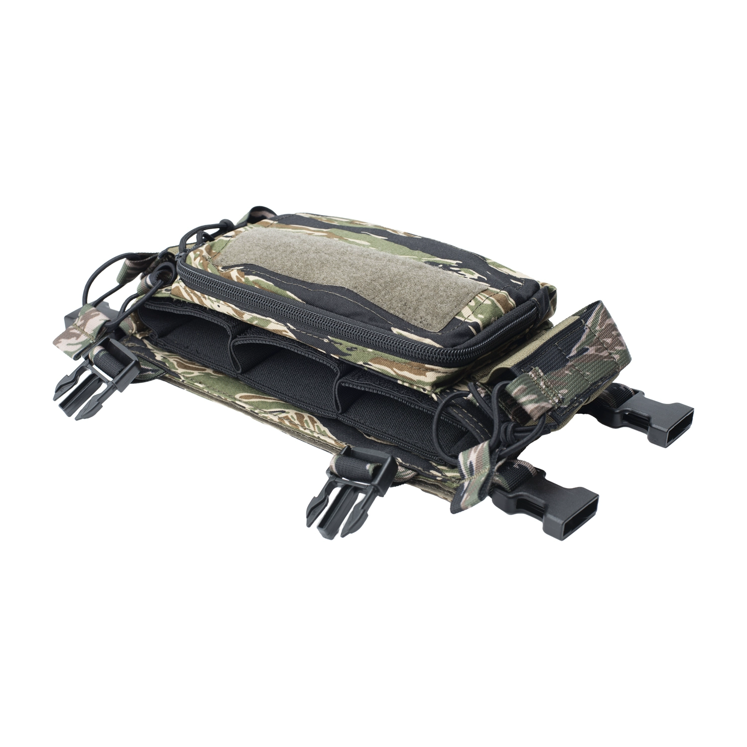 Colgador de pecho D3CRM; El compartimento principal ofrece un compartimento extraíble de 3 pares 5,56 incorporado con un compartimento de herramientas de 2 pares en cada lado para facilitar el transporte de cargadores de 9mm, linternas o herramientas portátiles. El contenedor con cremallera frontal se puede utilizar para almacenar identificadores visuales o artículos personales.