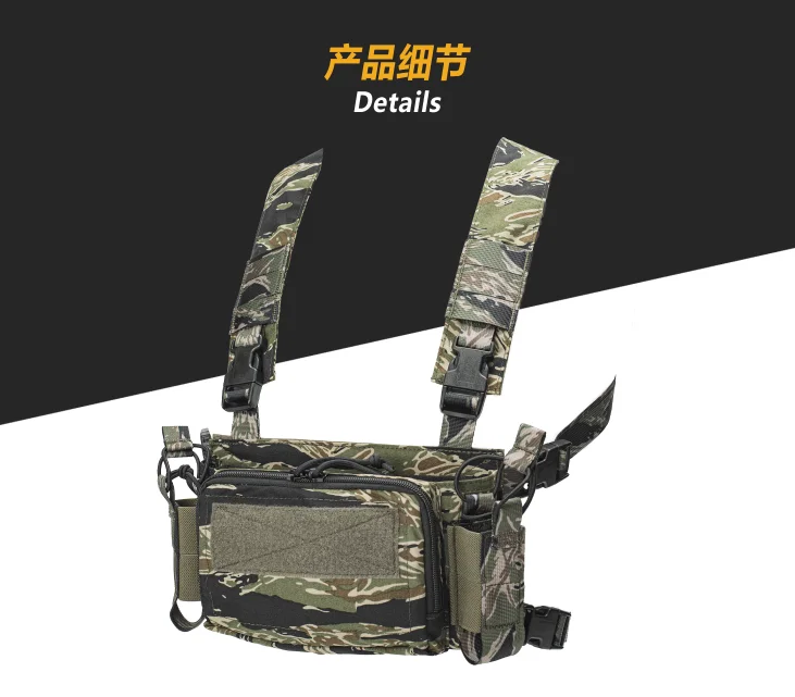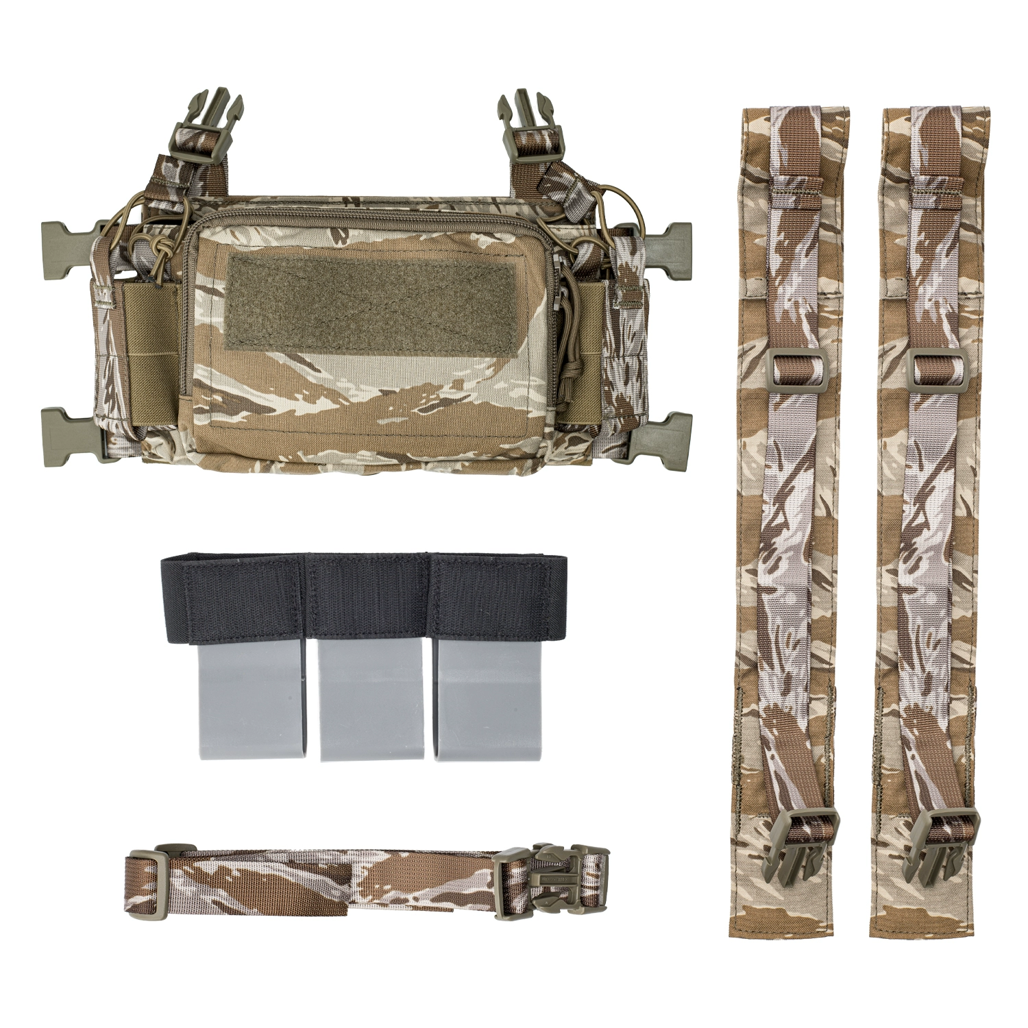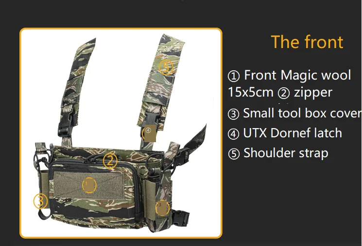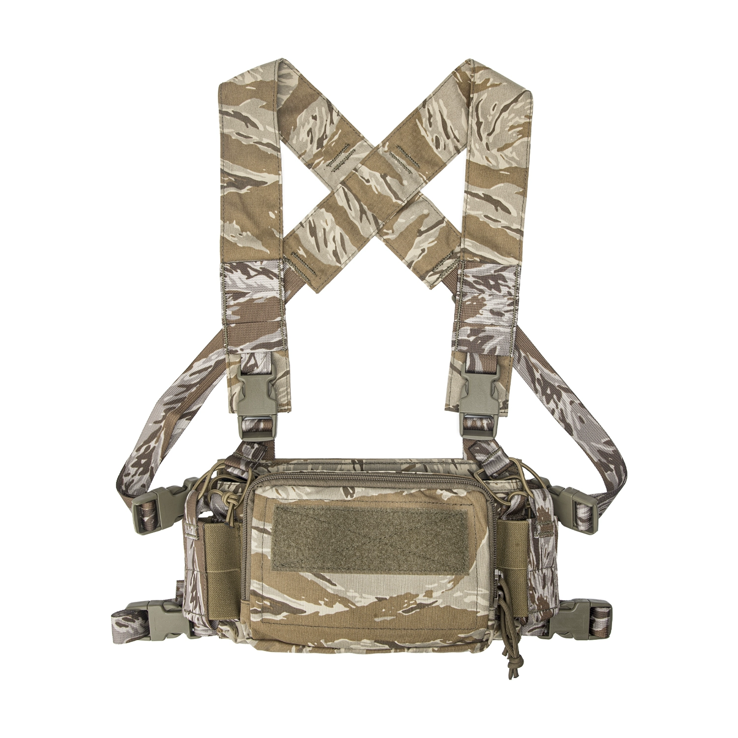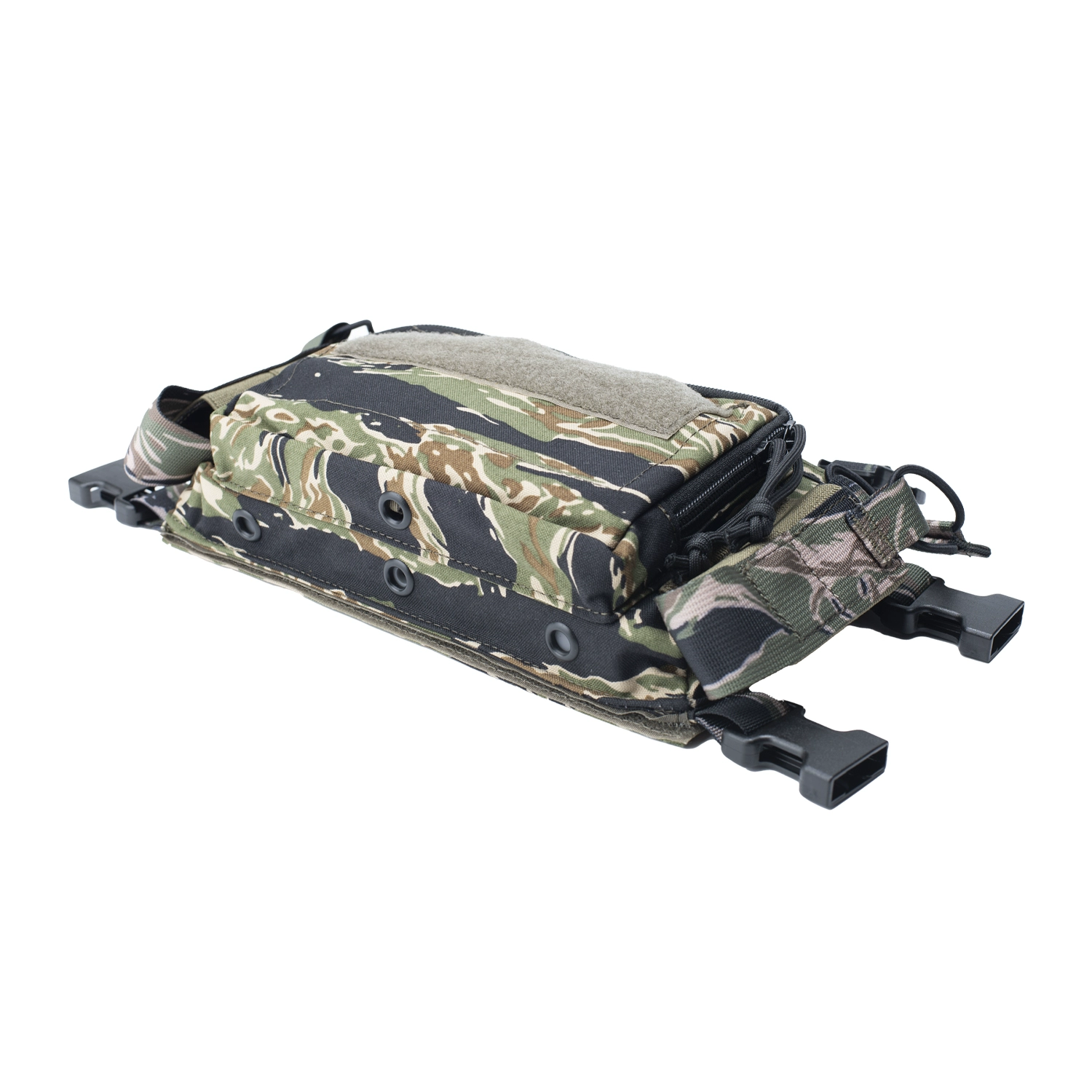 Colgador de pecho D3CRM; El compartimento principal ofrece un compartimento extraíble de 3 pares 5,56 incorporado con un compartimento de herramientas de 2 pares en cada lado para facilitar el transporte de cargadores de 9mm, linternas o herramientas portátiles. El contenedor con cremallera frontal se puede utilizar para almacenar identificadores visuales o artículos personales.