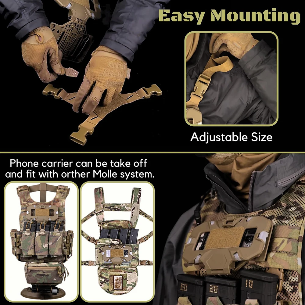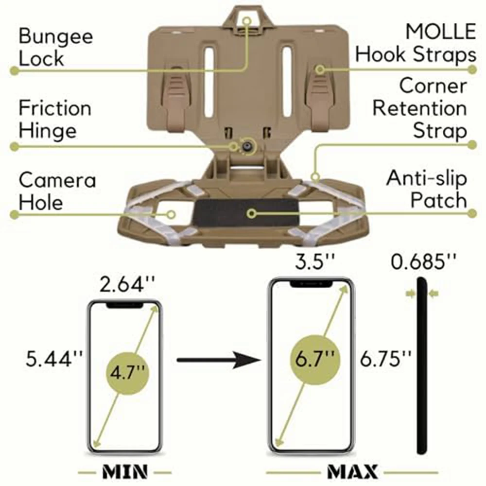 COMPATIBILIDAD: este soporte de teléfono Tactical Plate Carrier, que se utiliza como tablero de navegación de bolsa de administración de airsoft, es adecuado para una amplia gama de marcas y tamaños de teléfonos, se recomienda quitar la funda del teléfono antes de usarla. Puede soportar hasta 6,7 pulgadas de fijación, pero el teléfono de 4,7-6,2 pulgadas es el tamaño recomendado, buena fijación y no estará expuesto.