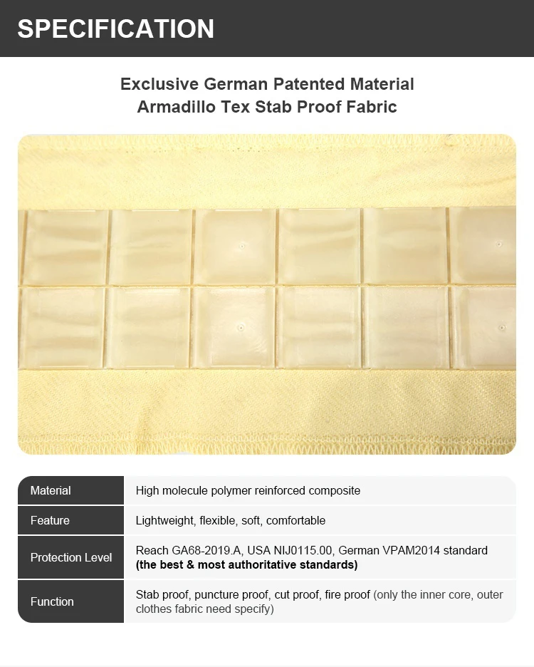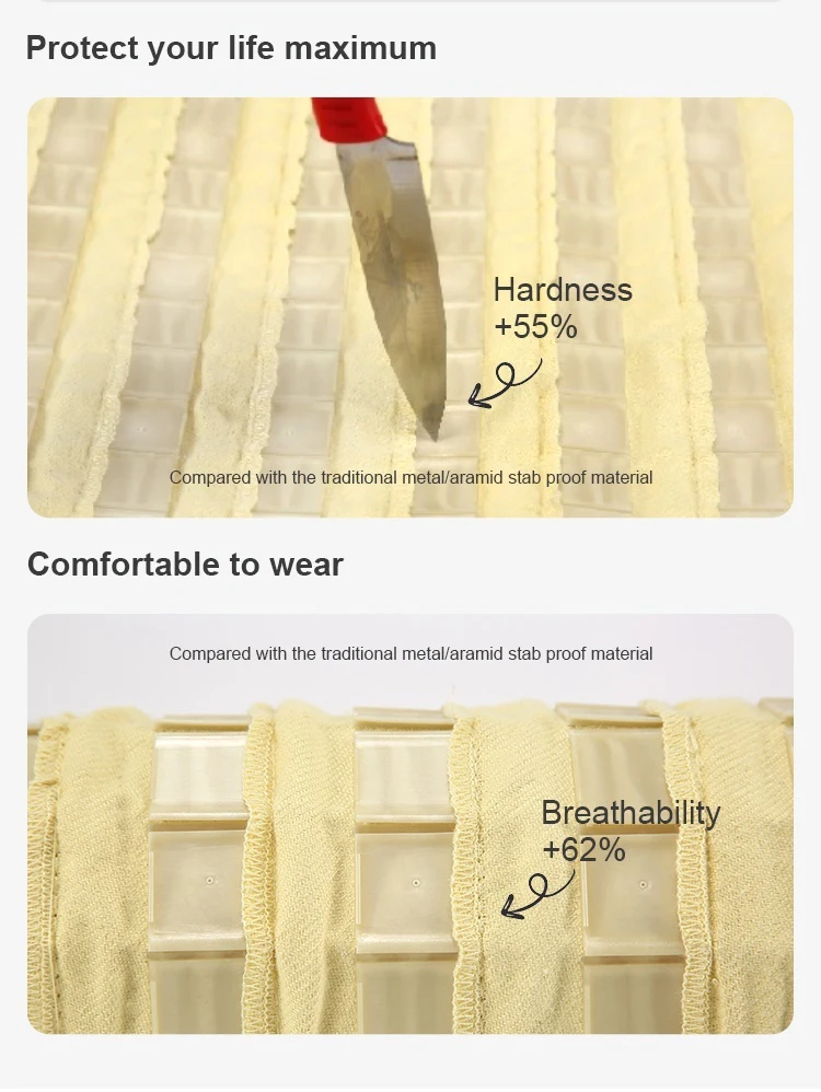 Anti-puñaladas, anti-puñaladas, anti-corte y resistente a los cortes, suave y flexible, el peso es comparable al de una chaqueta ordinaria, el cuello, los hombros y el área del sombrero también están protegidos, encubiertos y pueden pasar por controles de seguridad.