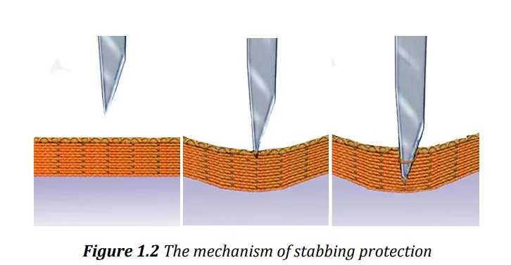 Las fibras de Saintfabric® están dispuestas aleatoriamente y entrelazadas para formar una estructura de red apretada e irregular, y luego las capas de la estructura de la red se superponen, por lo que el La punta de un cuchillo está unida y bloqueada por las capas de fibra durante el proceso de penetración, sin poder empujar todos los filamentos para penetrar suavemente en el cuerpo del usuario.