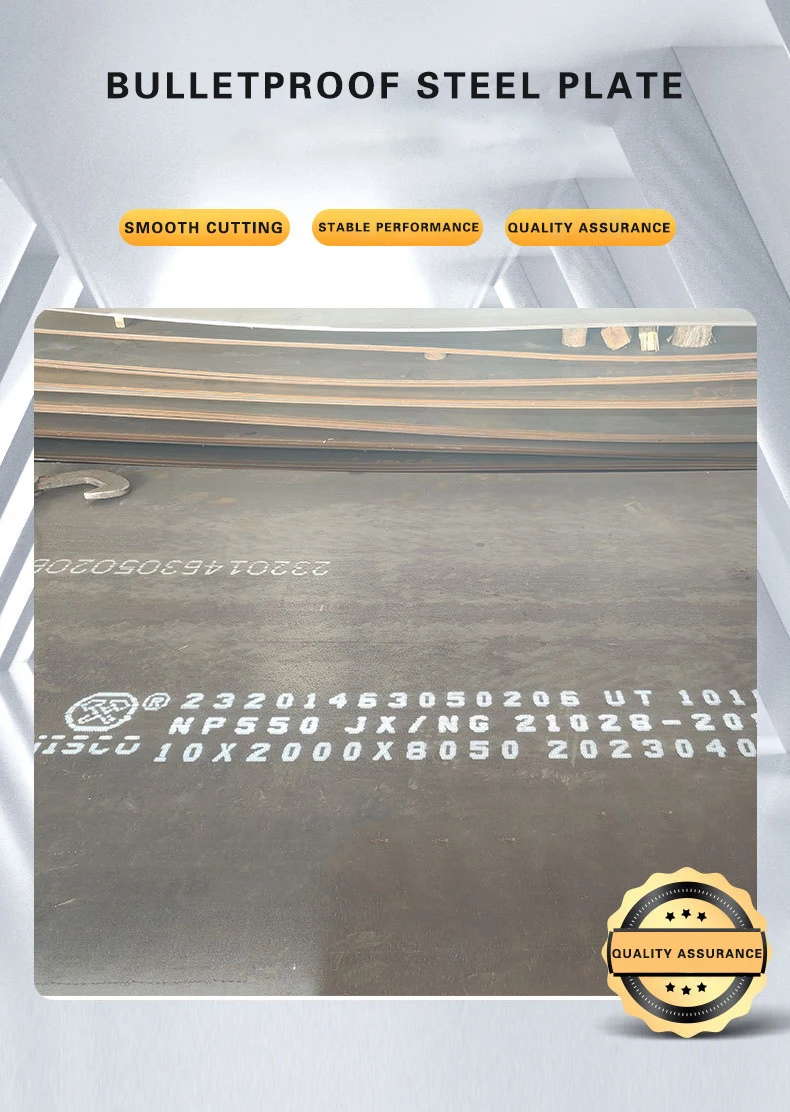 Alta dureza y resistencia: las placas de acero a prueba de balas generalmente están hechas de acero de alta resistencia, como el acero martensítico. Este acero se ha sometido a un proceso especial de tratamiento térmico y enfriamiento, que tiene una dureza y resistencia a la tracción extremadamente altas, y puede resistir eficazmente la penetración de balas y metralla.