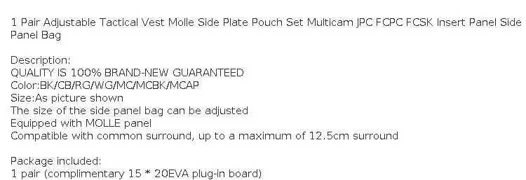 Chaleco táctico ajustable Molle, juego de bolsa de placa lateral JPC FCPC FCSK, bolsa de Panel lateral de inserción, 1 par
