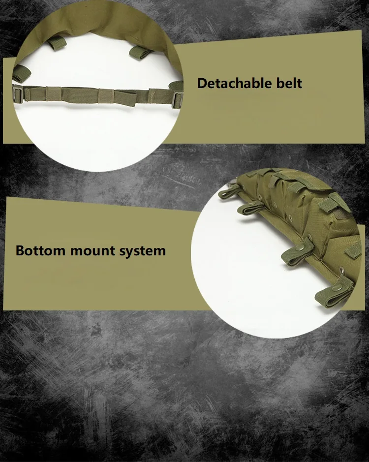 -4 bolsas para cargadores de rifle, cada bolsa puede contener hasta 2 cargadores tipo 7,62 (o 3 cargadores tipo 5,56) en forma de plátano