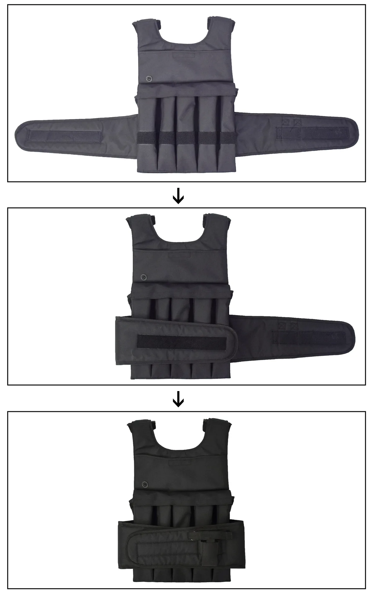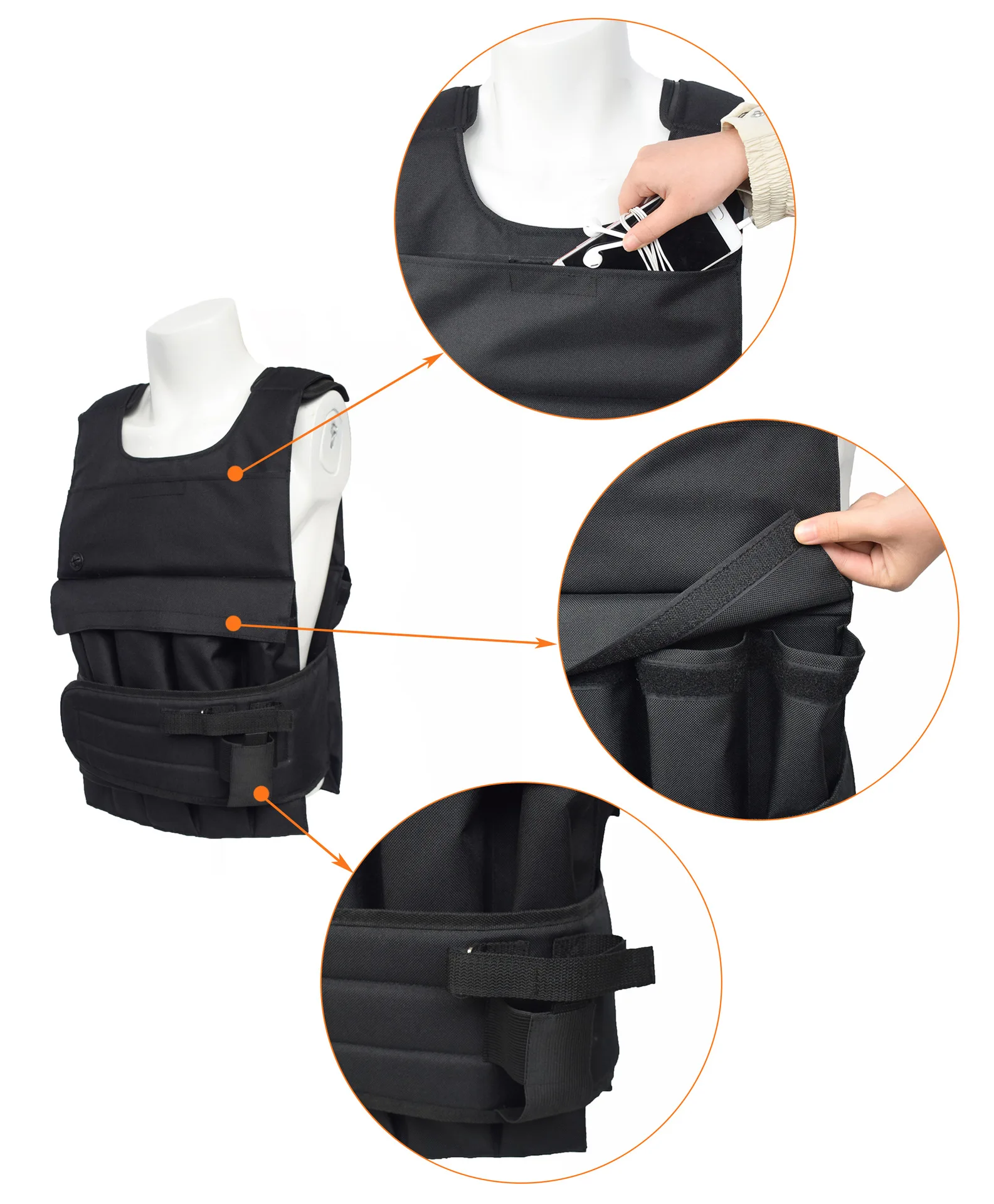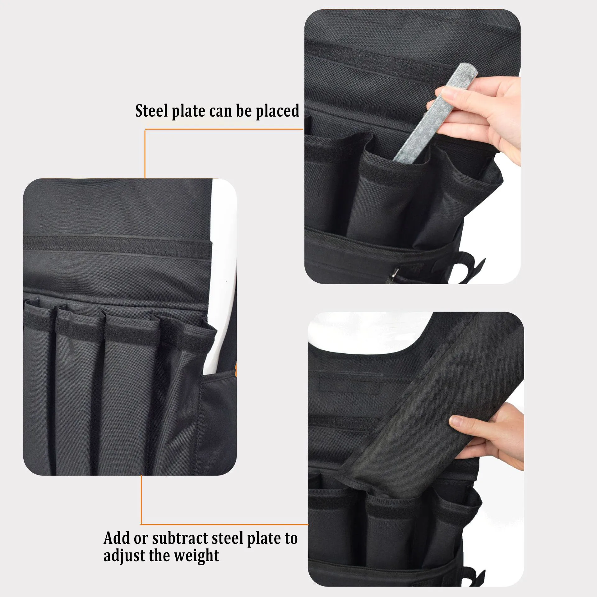 Hecho de tela oxford espesante de alta densidad, duradera al usar. Diseñado con un hombro ensanchable, cómodo de llevar. Forro interior de esponja comprimida altamente flexible, para protección y absorción de impactos. Con 10 piezas de bolsas para cargar arena o placa de acero. Es Un equipo ideal para fitness, perder peso y hacer ejercicio ágil.