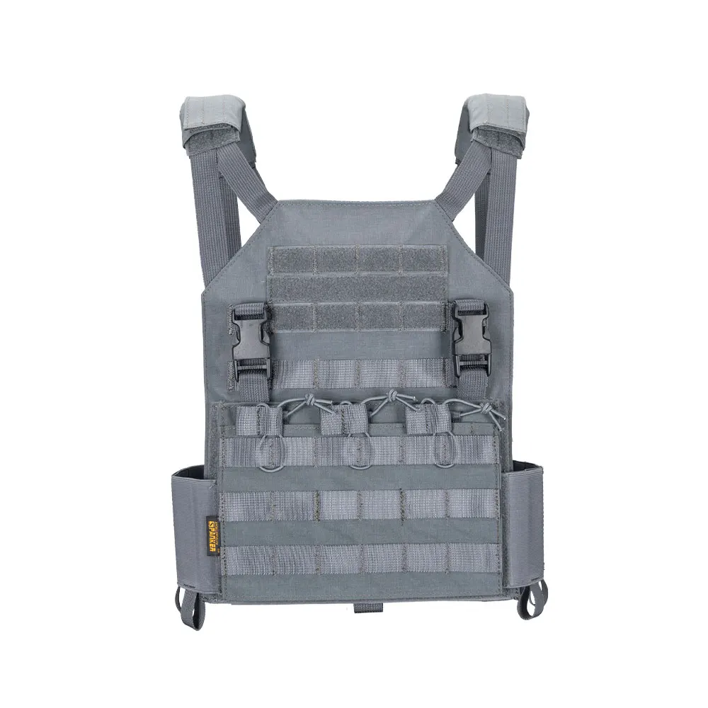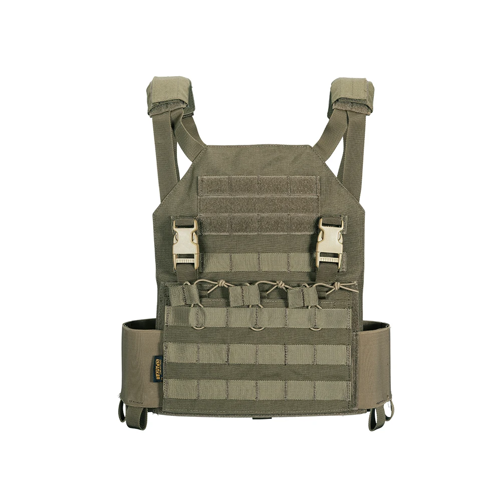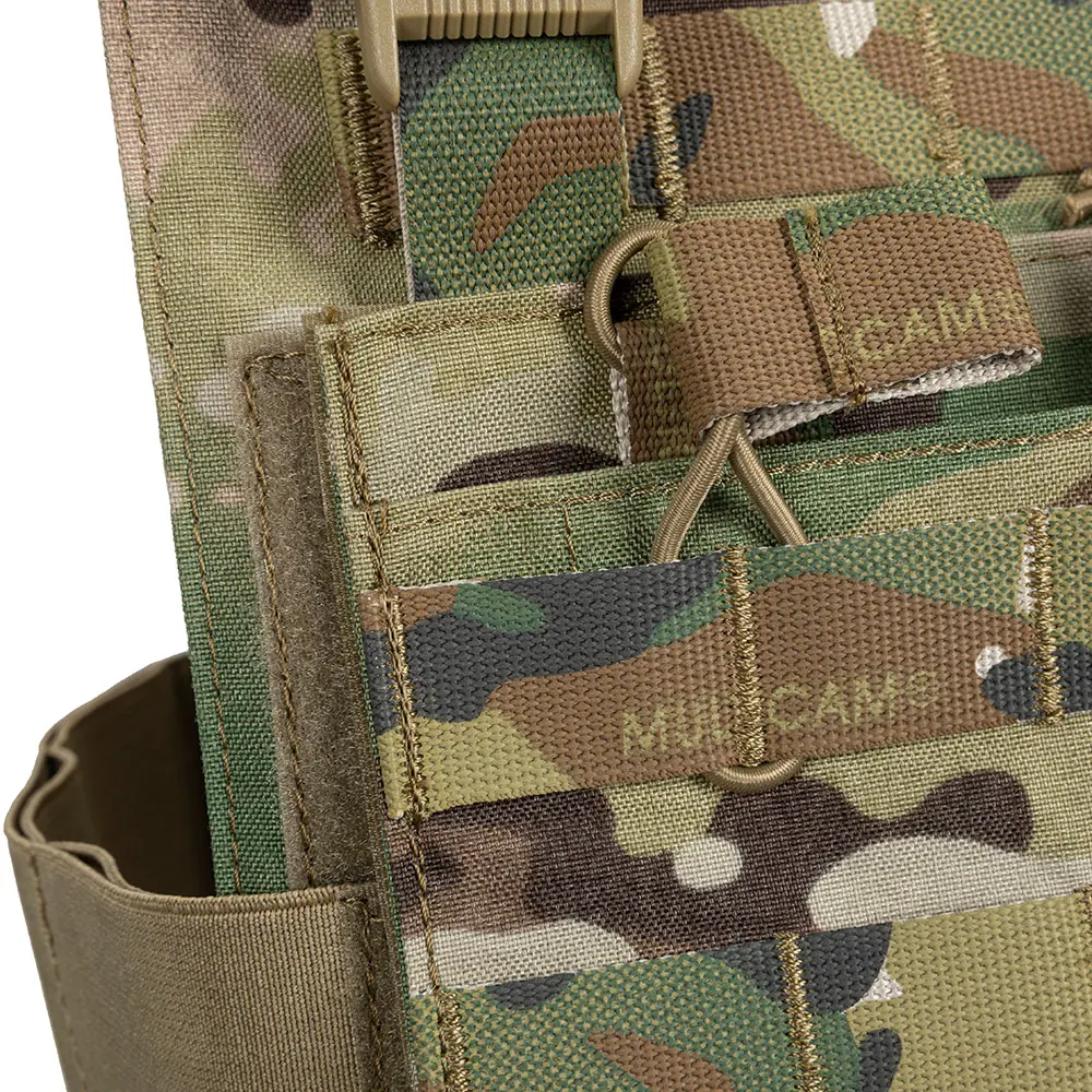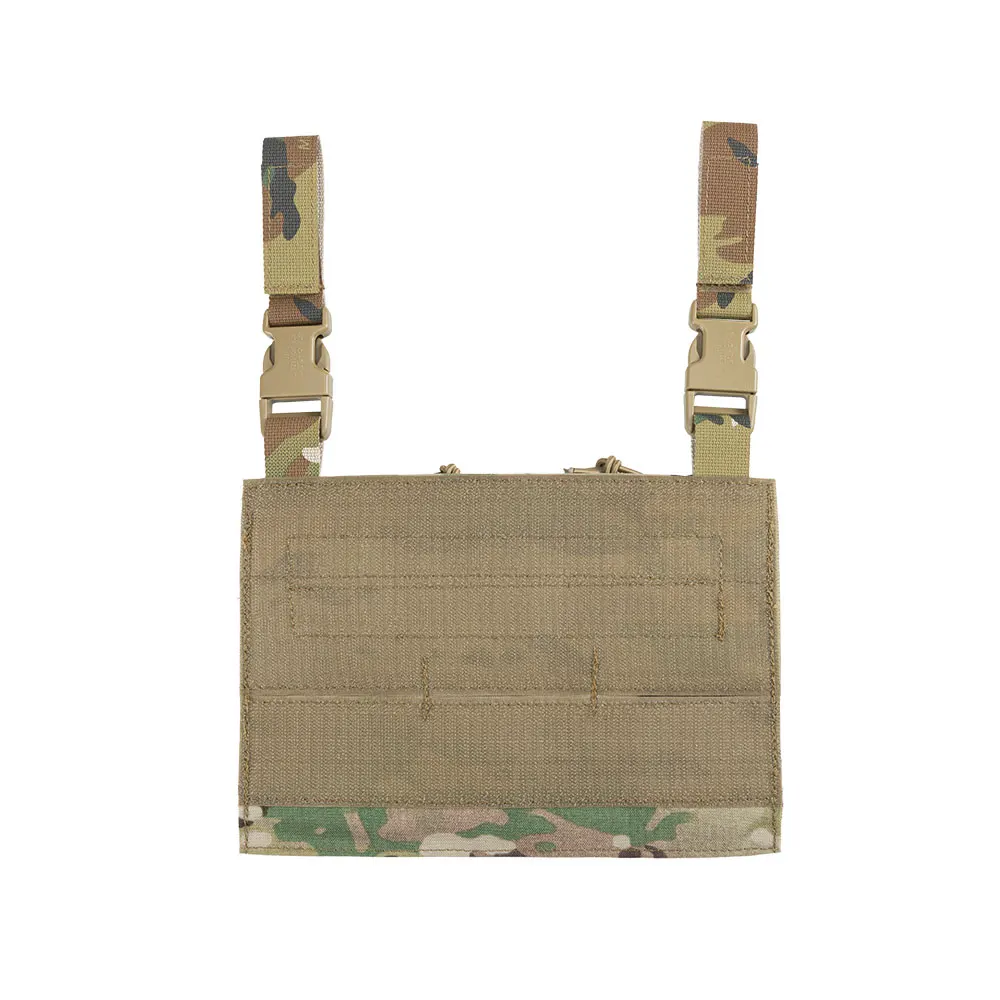 Chaleco táctico frente a la composición por el Panel mágico que se puede conectar al módulo de algunos cargadores. La parte posterior del chaleco está compuesta por el sistema MOLLE, que se puede conectar a otros equipos pequeños.