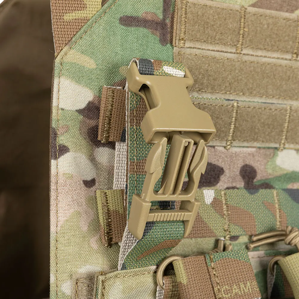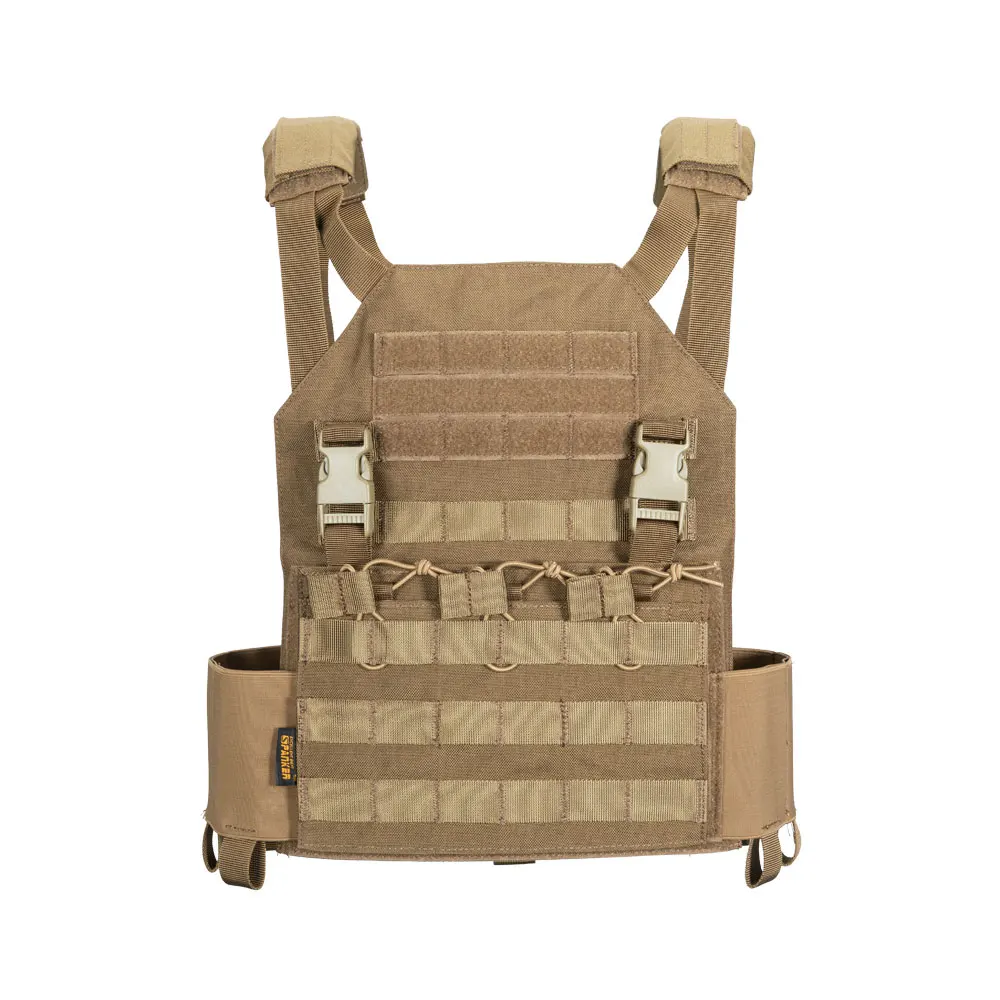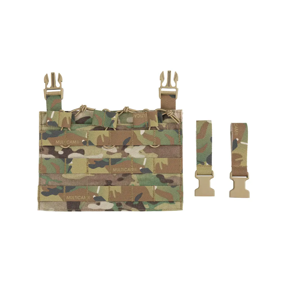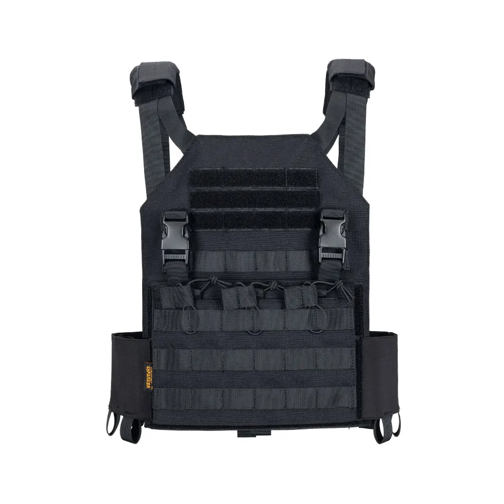 Chaleco táctico frente a la composición por el Panel mágico que se puede conectar al módulo de algunos cargadores. La parte posterior del chaleco está compuesta por el sistema MOLLE, que se puede conectar a otros equipos pequeños.