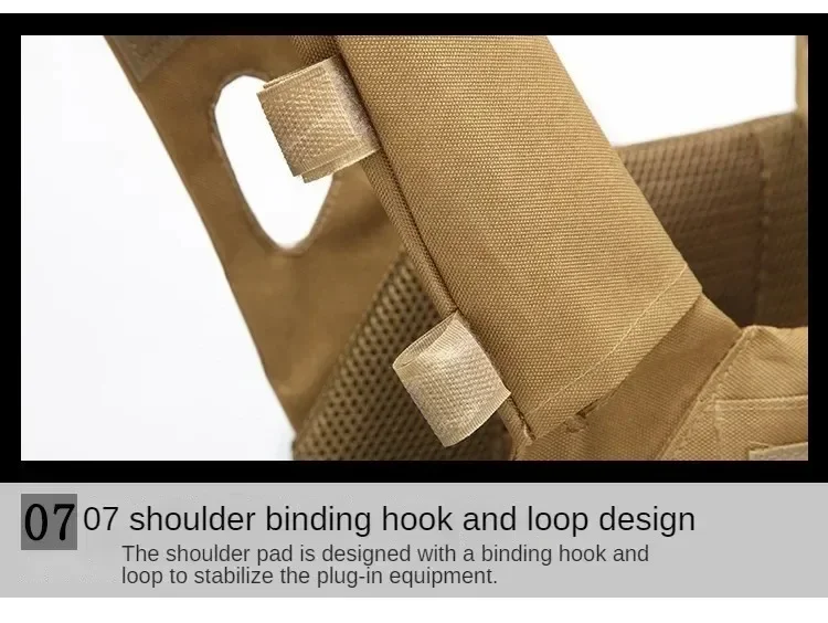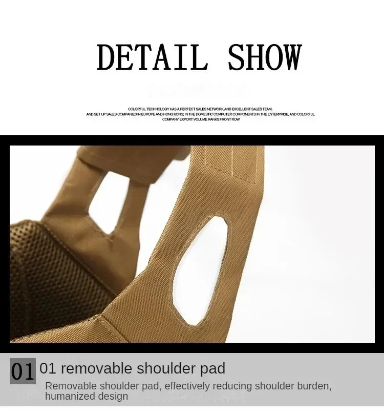 2: Diseño de cinturón molle delantero y trasero:Es conveniente equiparse con varias bolsas de accesorios.Diseño de correa adhesiva molle en el pecho, se puede pegar con adhesivo y otros equipos.