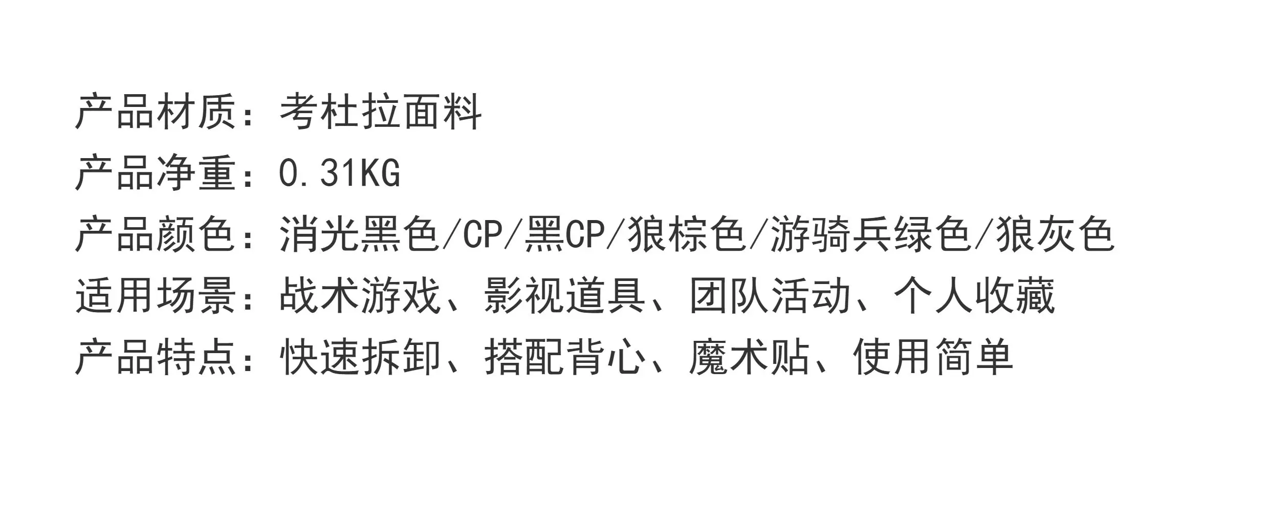 Está disponible en varios colores, incluidos negro mate, CP, CP negro, marrón lobo, verde Ranger, gris lobo, etc., adecuado para juegos tácticos, accesorios de cine y televisión, actividades de equipo y colección personal, etc. El diseño de la tira magnética es fácil de operar y es un excelente accesorio para mejorar la practicidad del equipo táctico.