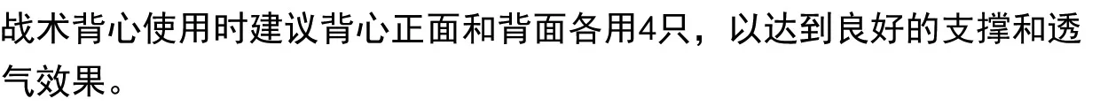 Cuando utilice chalecos tácticos, se recomienda utilizar cuatro de cada uno en la parte delantera y trasera del chaleco para lograr un buen soporte y transpirabilidad.