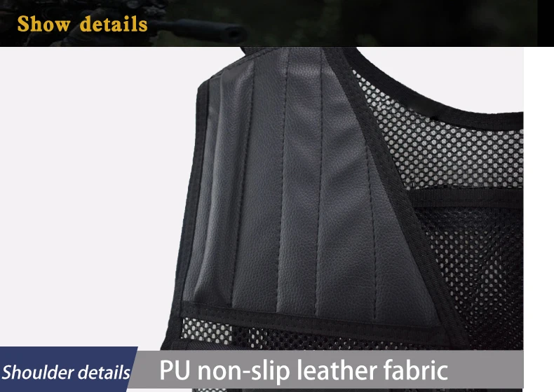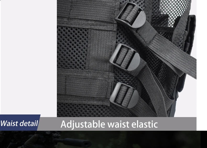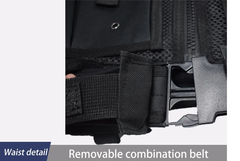 Tela de nylon Oxford 600D con revestimiento impermeable de PU tratamiento repelente al agua superficialCombinación de diseño modular, todas las suturas anudadas de cinta se han tratado comoComponentes: Táctico Chaleco * 1