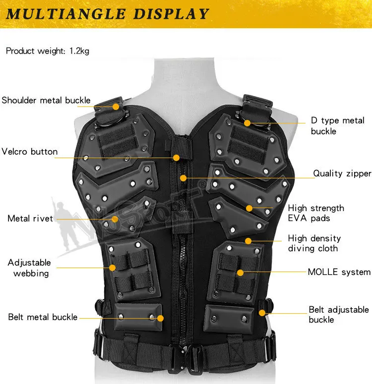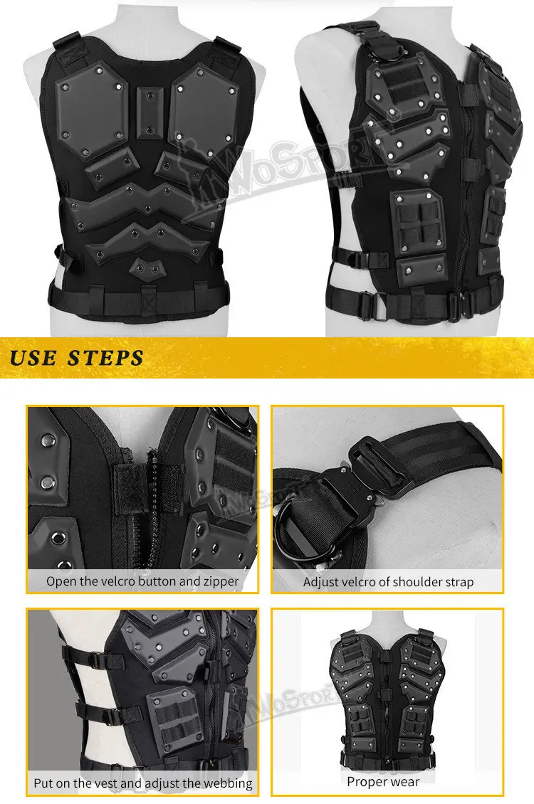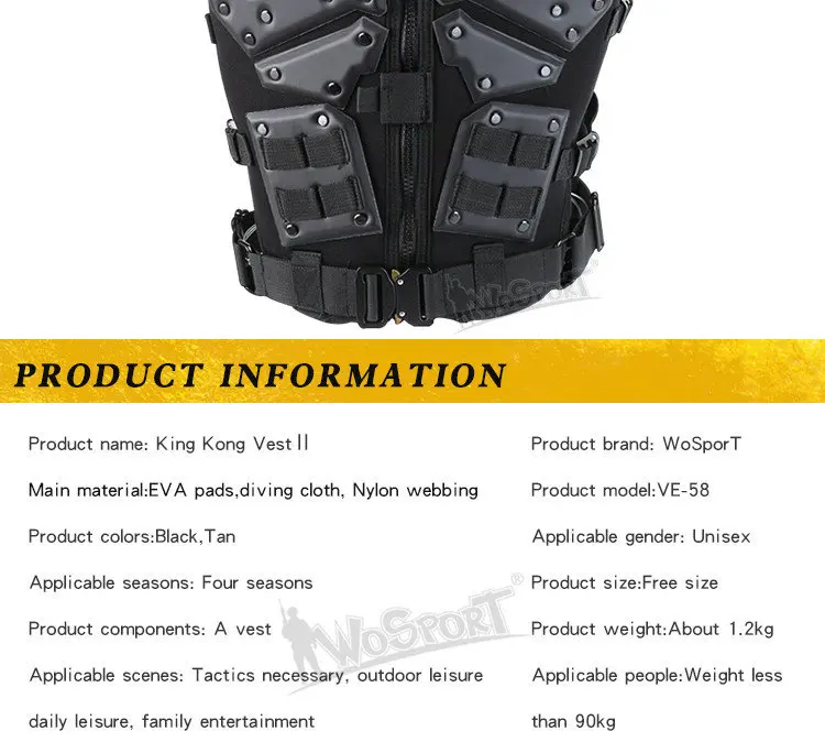 Embalaje del producto: bolsas Tamaño del producto: 51x38CM Peso neto del producto: aproximadamente 1,2 KG Peso bruto del producto: aproximadamente 1,25 KG Accesorios del producto: chaleco uno Color del producto: negro, bronceado Material principal: guardabarros EVA, esponja de alta elasticidad, cinta de nailon El paquete incluye: 1 * chaleco táctico